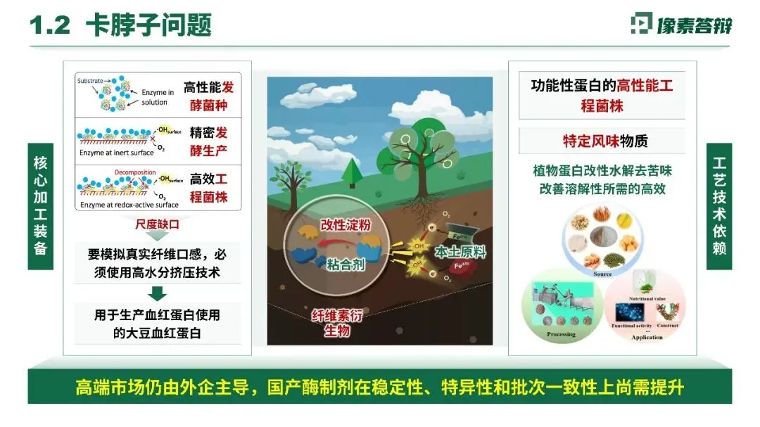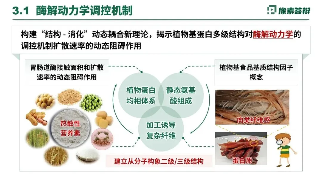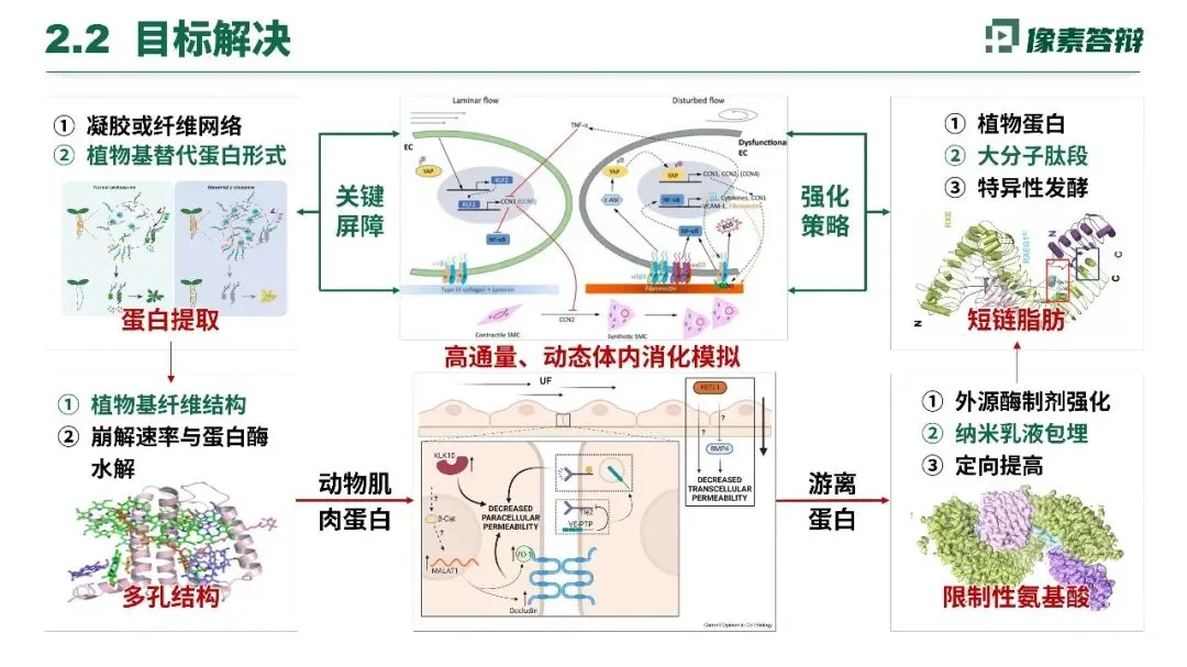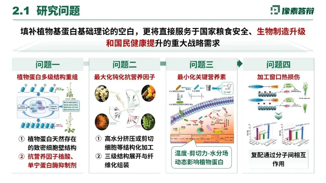 项目梳理出植物蛋白结构重组、抗营养因子、营养素流失、加工热损伤四大核心问题。针对性采用酶制剂强化、纳米包埋等技术优化提取,模拟动物蛋白结构,借助动态消化模拟,突破消化吸收屏障,填补基础理论空白。