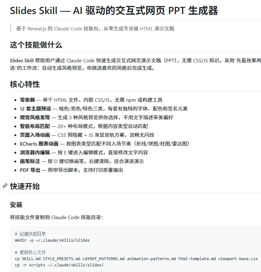 直到我上周在GitHub上发现了@zarazhangrui的开源项目Frontend Slides——一个基于Reveal.js的网页演示文稿框架。它验证了一个方向:用网页做PPT,交互性和视觉效果都可以比传统PPT更强。