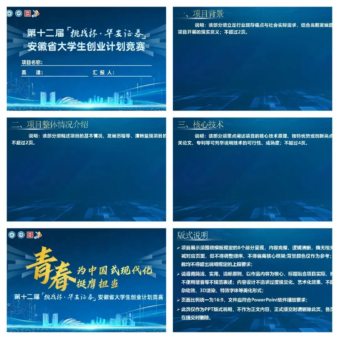 给大家整理了最新的安徽省“挑战杯”创业计划竞赛的PPT模板,内容母版均已设置完成,每部分重点要体现的内容也做了说明,大家结合自己的项目做调整修改即可。