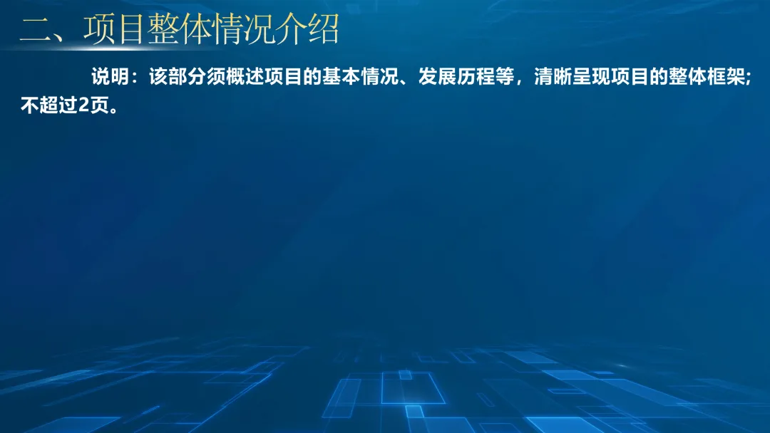 1.项目展示须围绕模板规定的8个部分呈现,内容完整、逻辑清晰,确无相关内容可删减对应页面,但不得调整顺序、不得偏离核心框架;各部分页数均不得超出说明规定的上限要求;