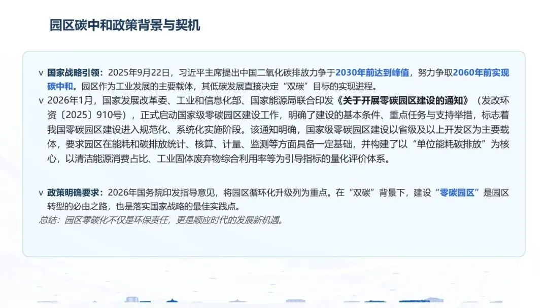 在我国推进碳达峰、碳中和目标,加快经济社会发展全面绿色转型的关键时期,零碳产业园区作为产业集聚与低碳发展的核心载体,正从地方探索上升为国家战略部署。它不仅是破解产业领域碳排放难题的重要抓手,更是推动产业结构优化、能源体系转型、区域协调发展的重要实践平台。