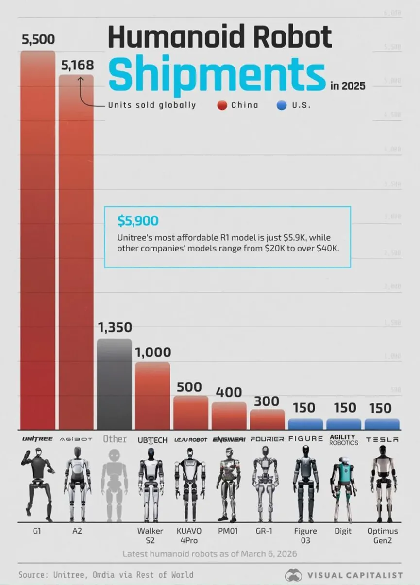 紧随其后的是智元(出货超4000台,全球占比23.5%)、乐聚、加速进化、松延动力(各约1000台),以及优必选(约600台)。