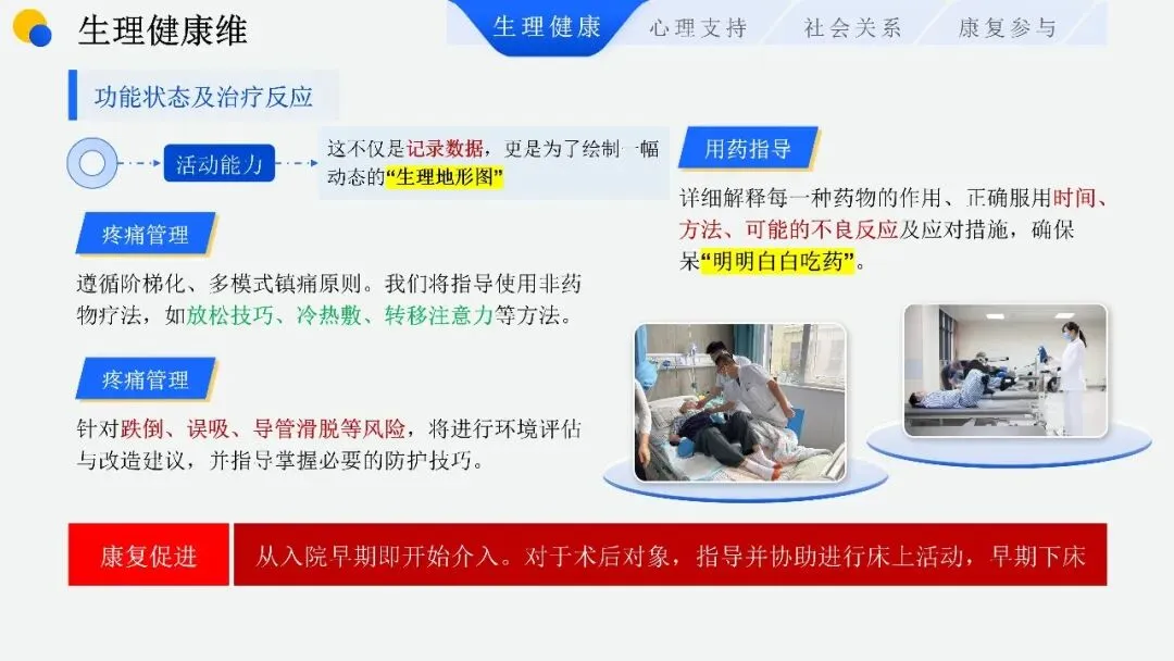 第一维是生理健康维,这是干预的基石。我们聚焦身体机能与疾病症状的精准管理,通过专业评估工具,全面监测生命体征、疼痛等级、营养状况,同时做好用药指导、风险防护与早期康复介入,为大家绘制动态的 “生理地形图”,筑牢健康根基。