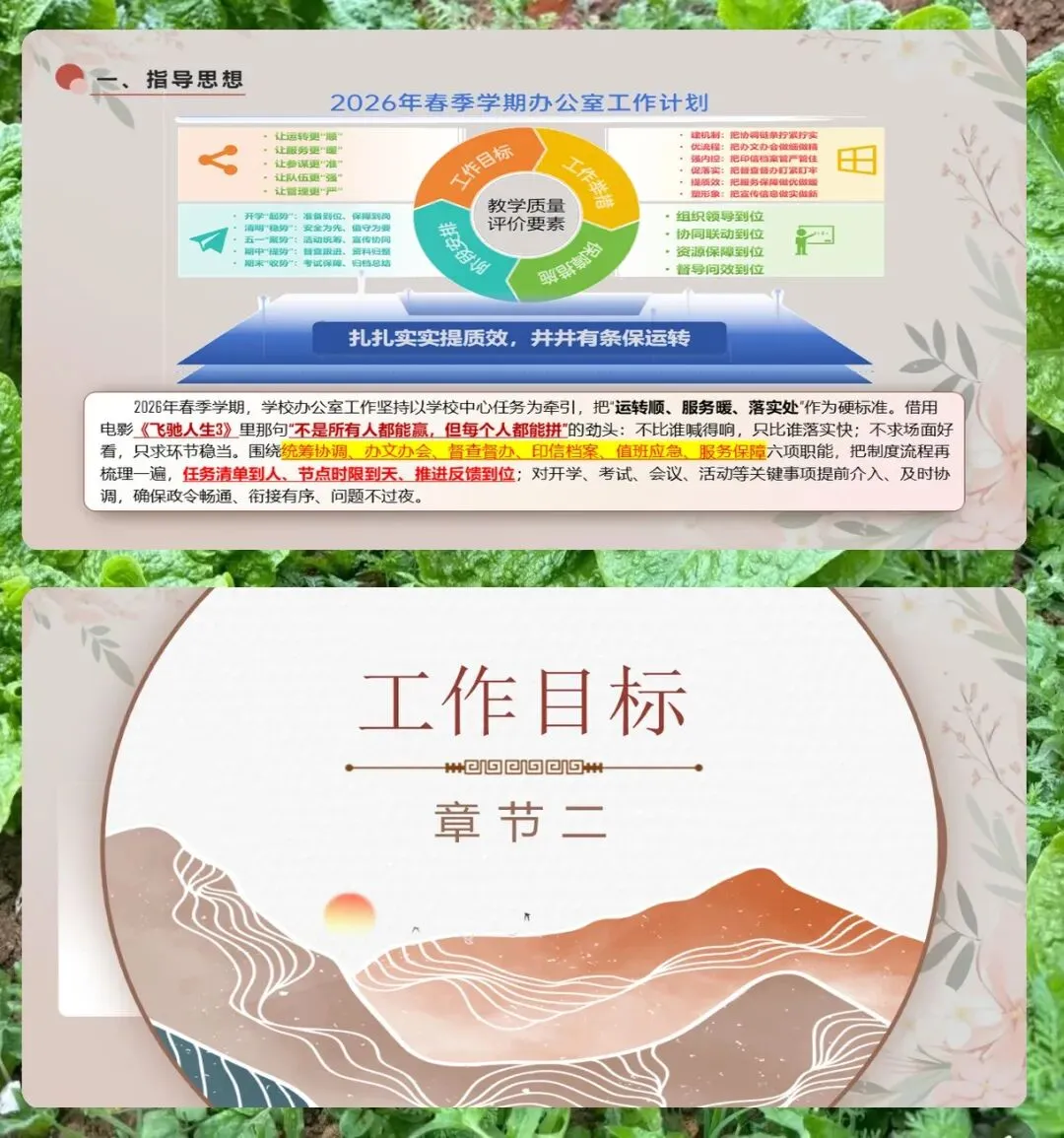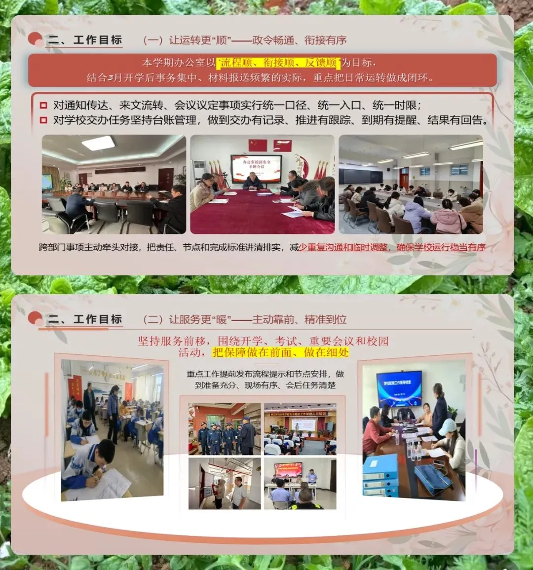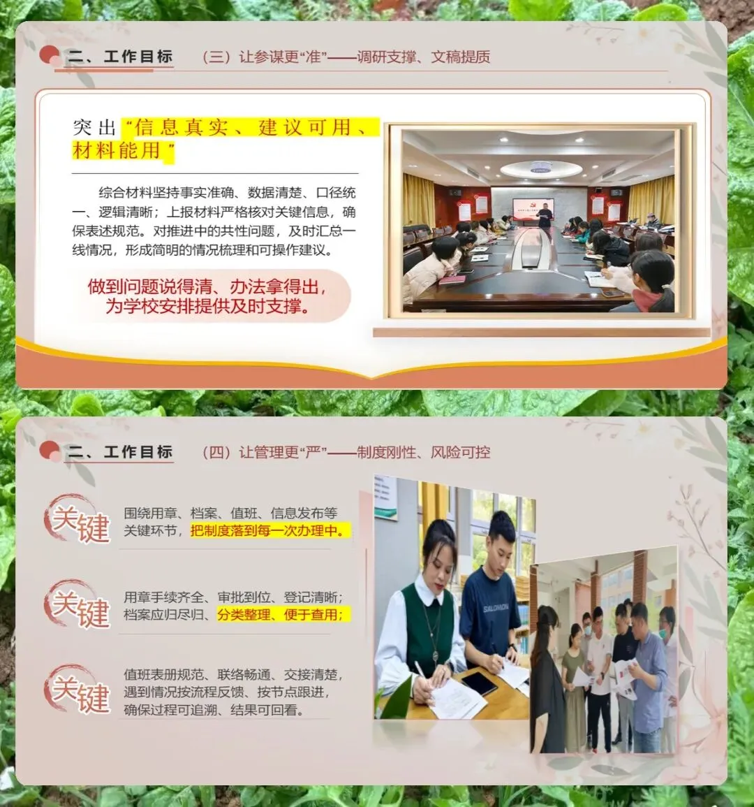 我们的目标很明确。一是运转顺畅,通知、文件、任务统一管理,用台账跟踪,跨部门事情主动对接,减少沟通麻烦。二是服务暖心,开学、考试、会议这些工作提前准备,把细节做到位。三是参谋准确,材料真实准确,及时汇总问题,给学校决策提供参考。四是管理严格,用章、档案、值班都按制度来,全程可追溯。五是队伍变强,练好公文、会务、协调这些基本功,提升工作能力。