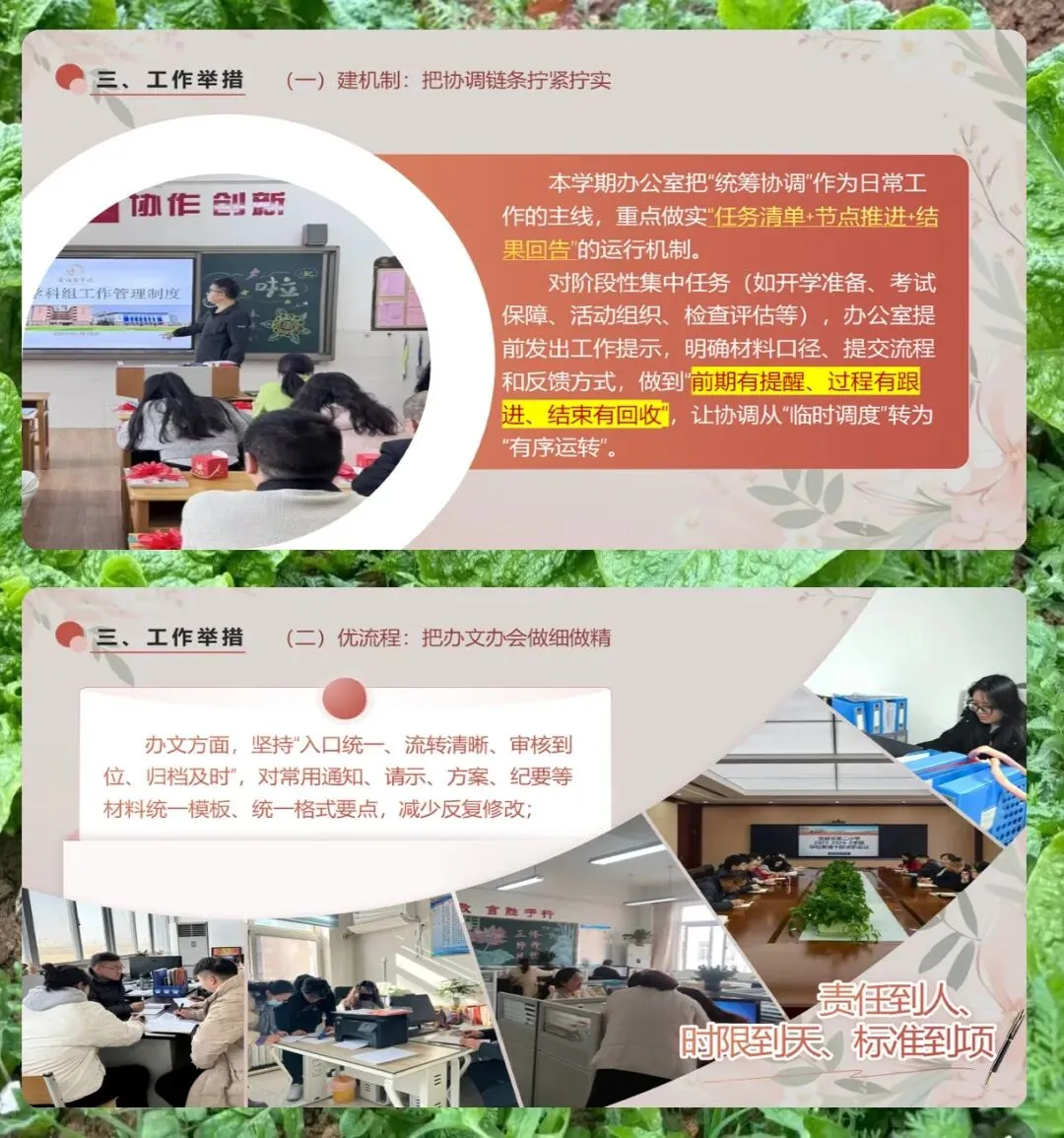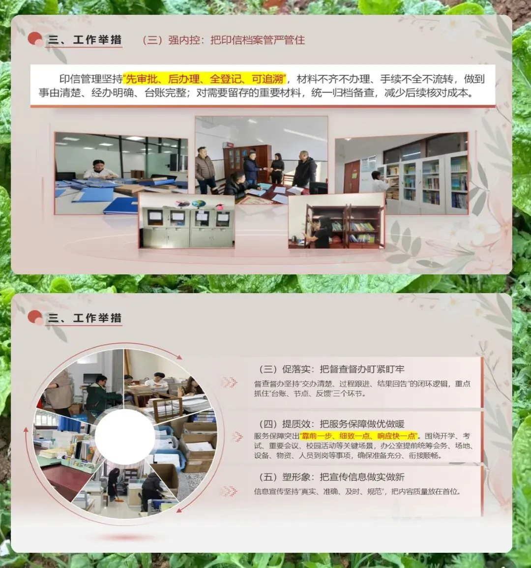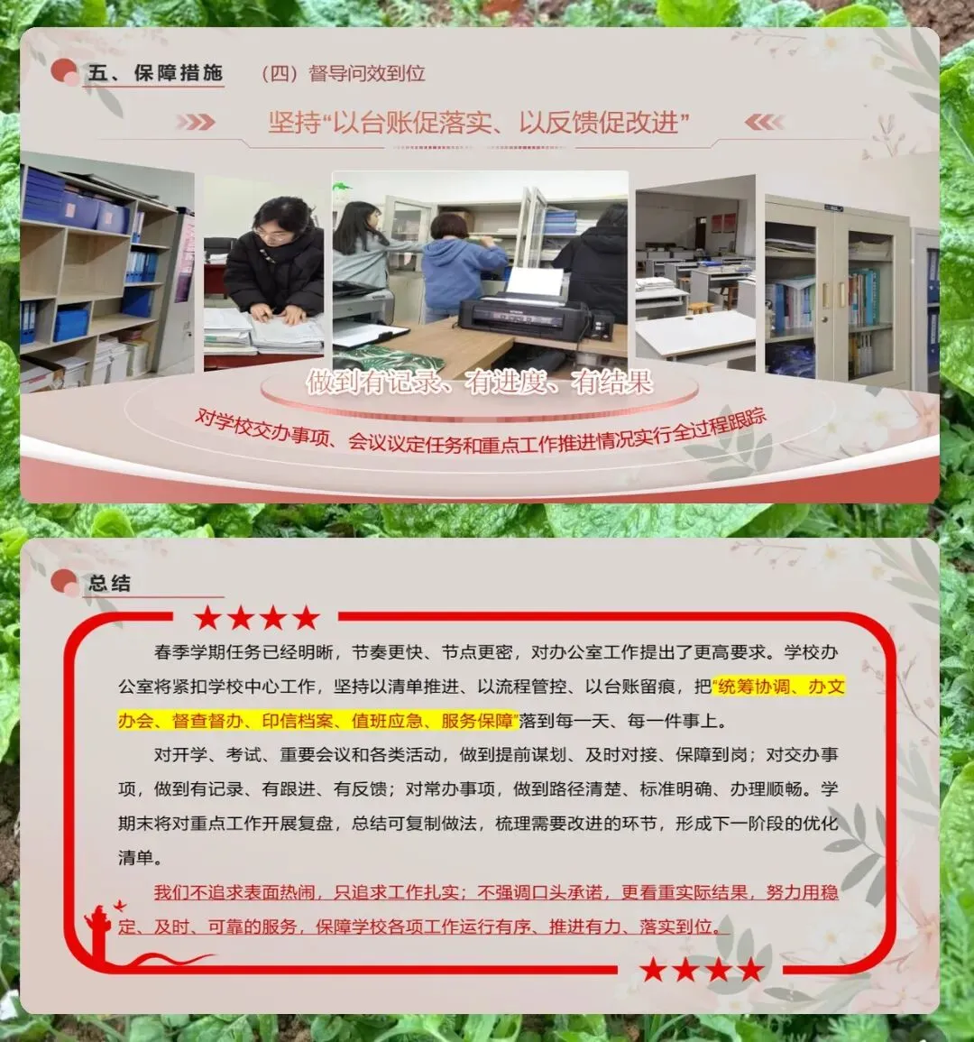 春季学期工作任务多、节奏快,办公室会把每一件事做实做细,不搞形式主义,只看实际效果,全力保障学校各项工作有序推进。我的汇报完毕,谢谢大家。