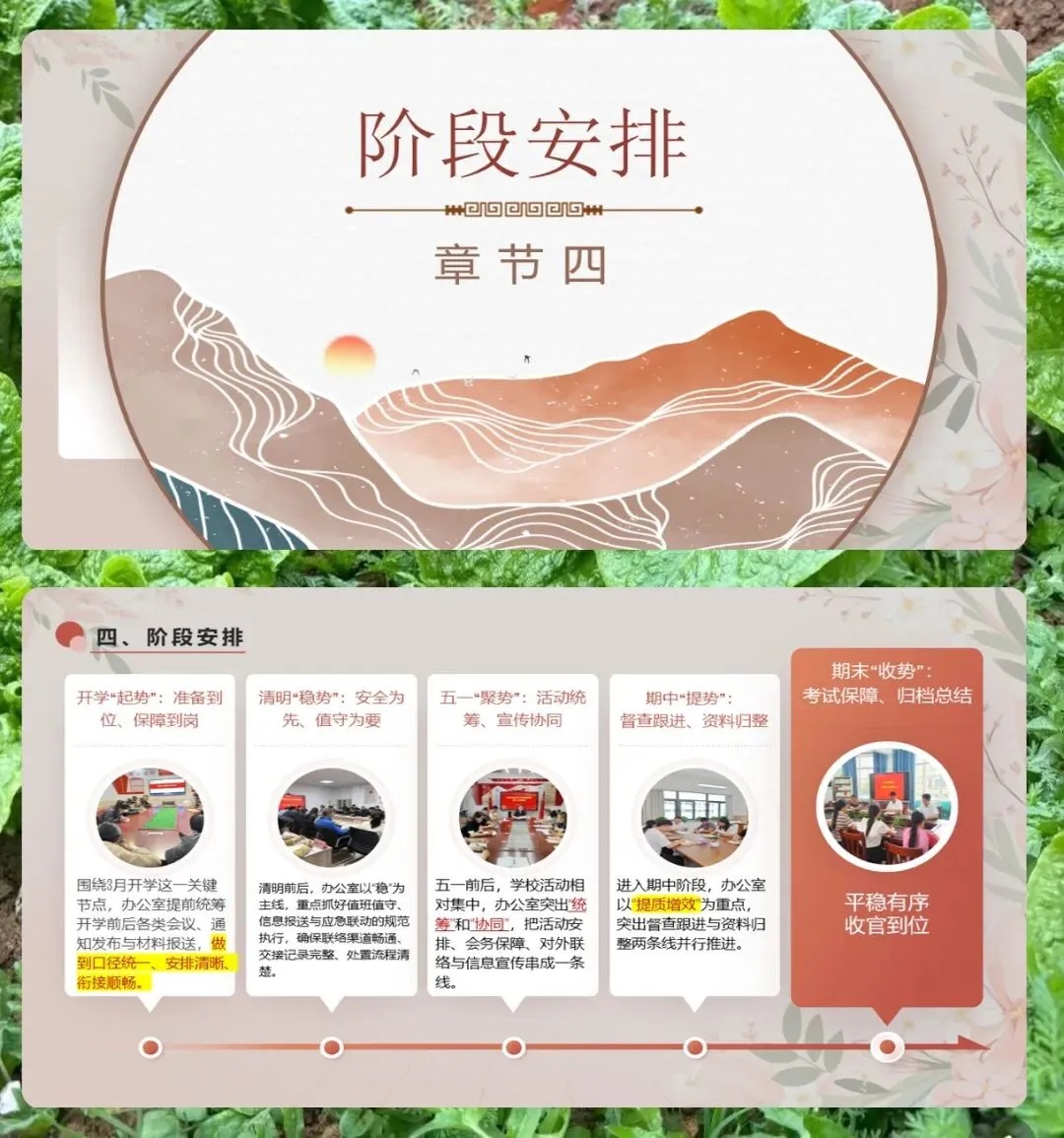 本学期工作分五个阶段推进。开学做好准备和保障,清明抓好安全值守,五一统筹活动和宣传,期中跟进督查、整理资料,期末保障考试、做好归档总结。