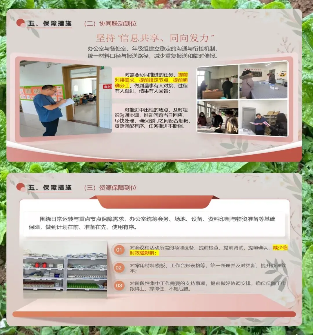为了完成这些工作,我们有四项保障。组织领导到位,分工明确、责任到人。协同联动到位,和各部门及时沟通,解决问题不拖延。资源保障到位,场地、设备、物资提前准备,模板及时更新。督导问效到位,全程跟踪工作,有记录、有进度、有结果。
