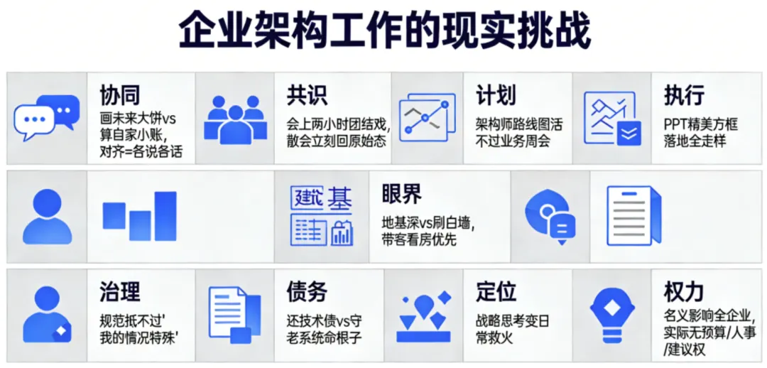 相信不少曾在企业中从事过企业架构工作的顾问,都会认同这样一个判断:企业架构最具挑战的,从来不在于框架或方法论本身,而在于那些藏在架构图之外的复杂现实。