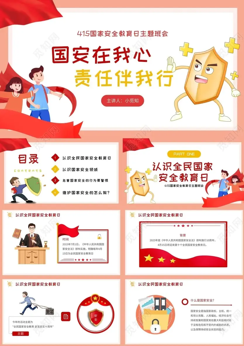 红色国潮卡通4月15日全民国家安全教育日主题班会PPT