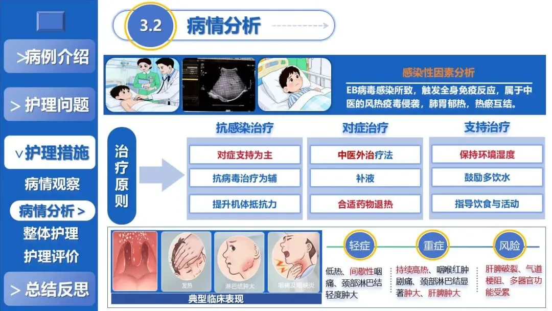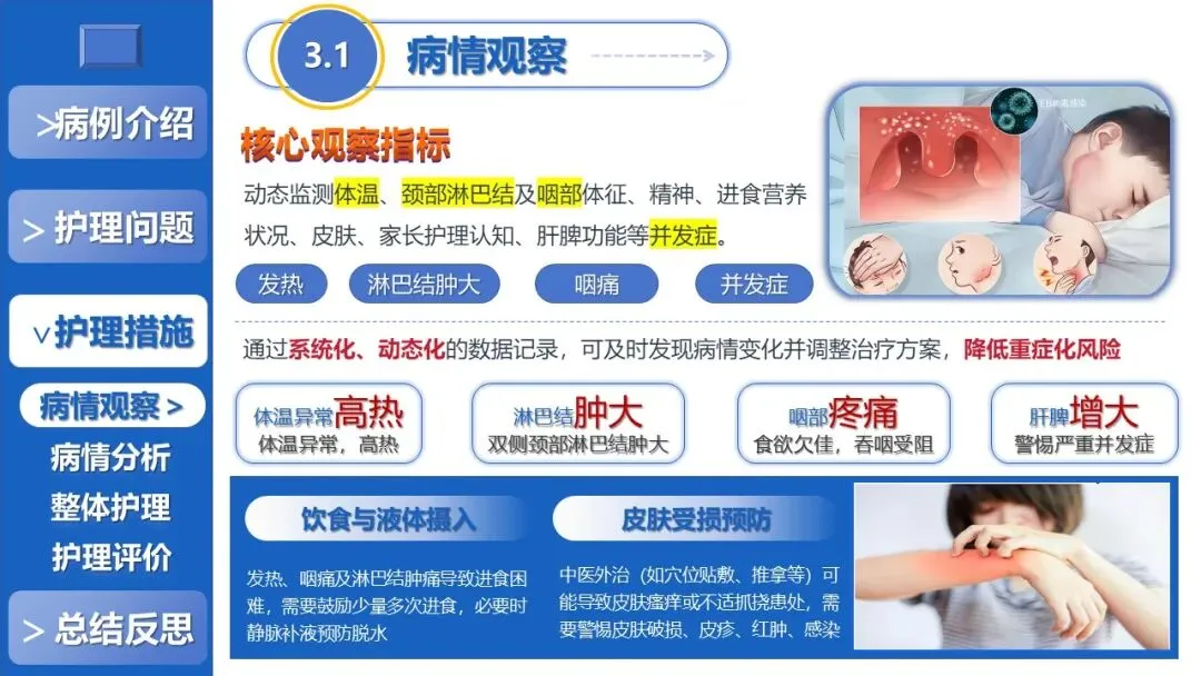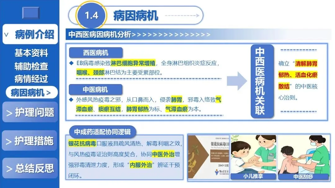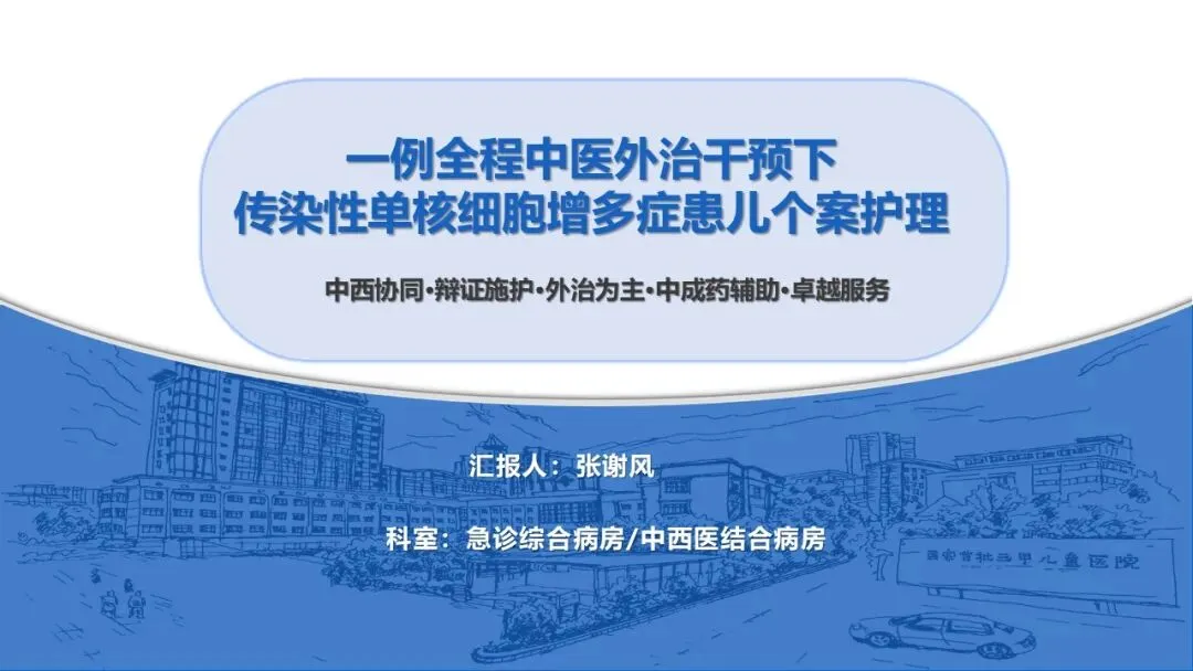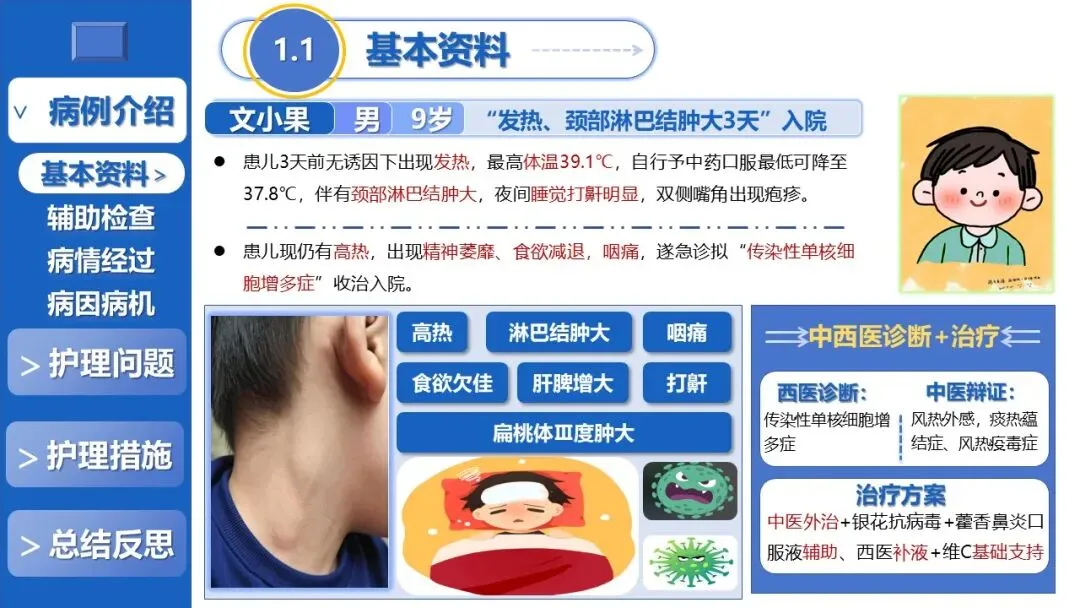 本课件聚焦儿童传染性单核细胞增多症的全程中医外治干预护理,以“中西协同、辨证施护、外治为主、中成药辅助”为核心原则,分病例介绍、护理问题、护理措施、总结反思四大板块展开讲解。