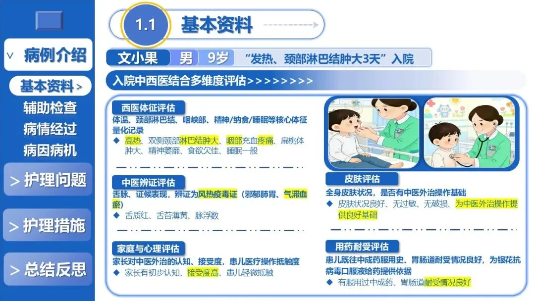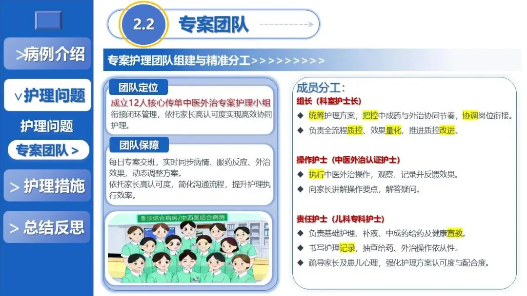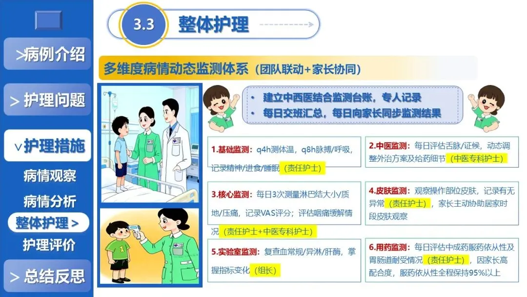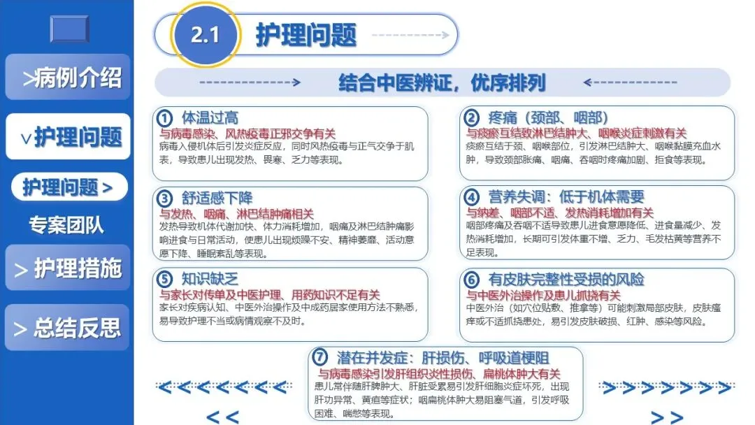 课件先以风热疫毒证患儿为例,介绍其病情表现、辅助检查结果及中西医病因病机,经多维度评估确立清解肺胃郁热、活血化瘀散结的核心治则,梳理出体温过高、颈部咽部疼痛、潜在肝损伤等7项护理问题,并组建专案护理团队完成精准分工,明确各岗位核心职责。
