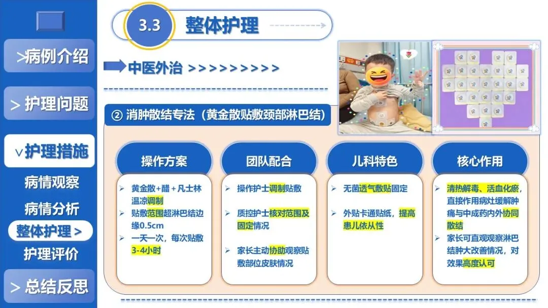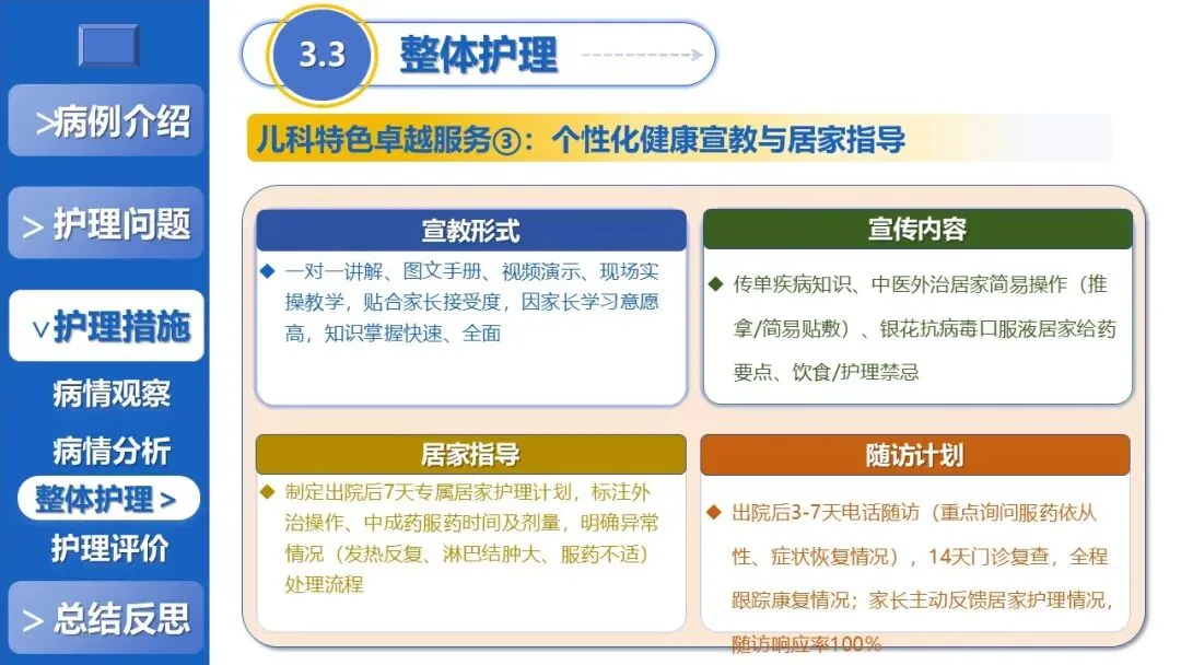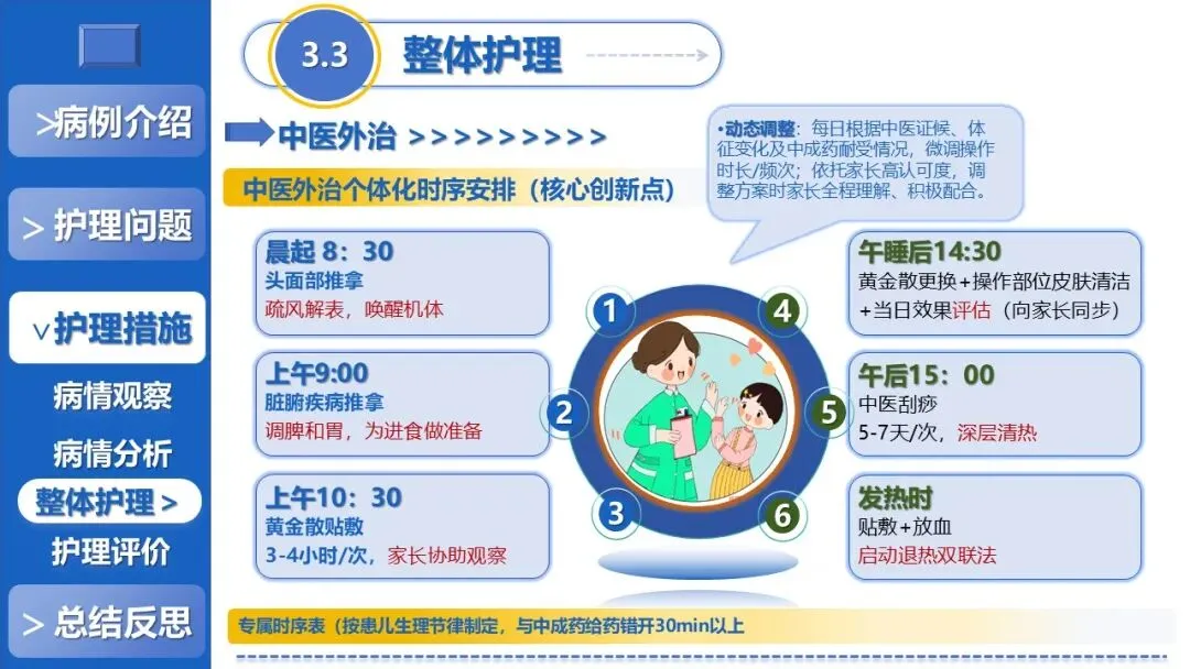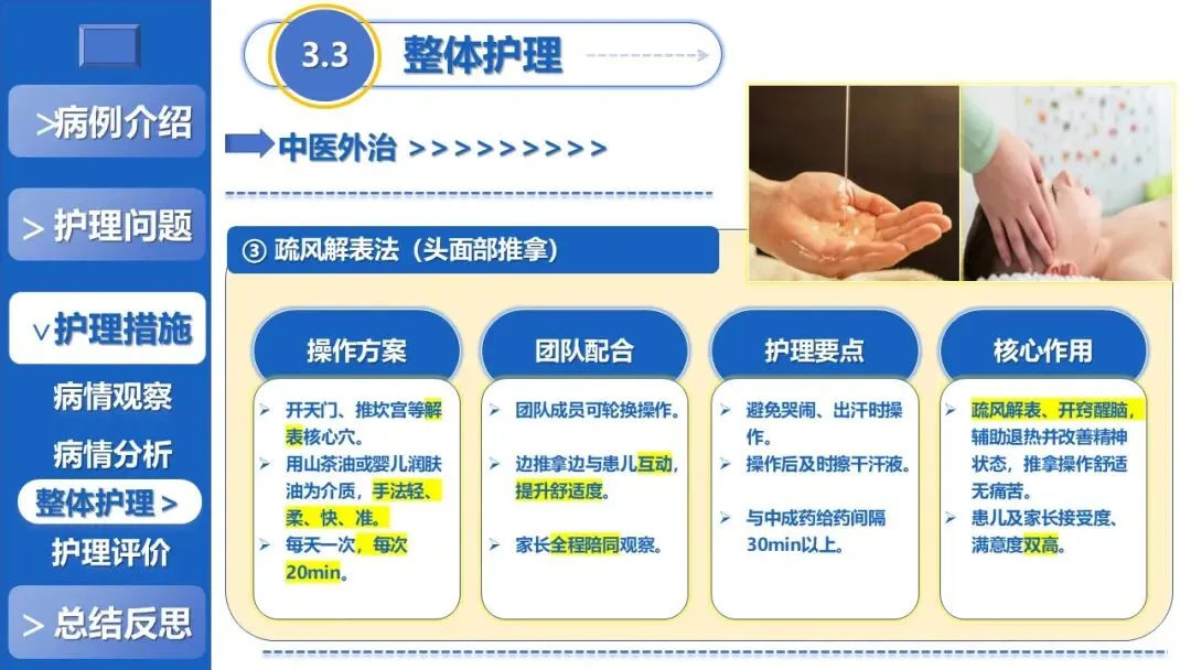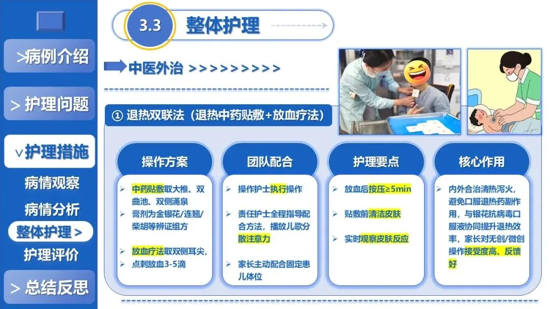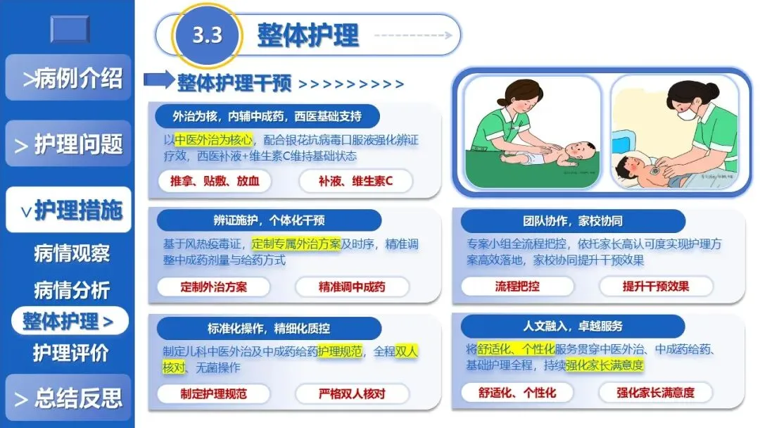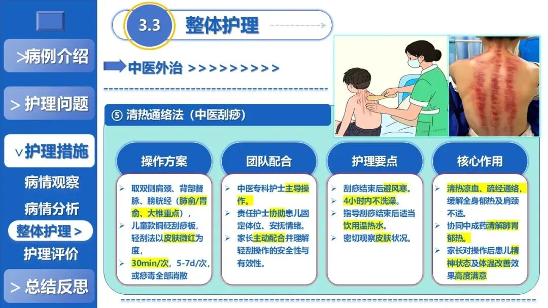 课件核心阐述了特色护理方案,以退热贴敷+放血、黄金散贴敷、推拿等5项中医外治为核心,搭配银花抗病毒口服液辅助、西医补液+维C基础支持,定制贴合患儿生理节律的外治个体化时序,同时建立多维度动态监测体系、制定并发症三级预警方案,融入儿科舒适化护理、全周期人文疏导与个性化健康宣教,构建高效家校协同护理模式。