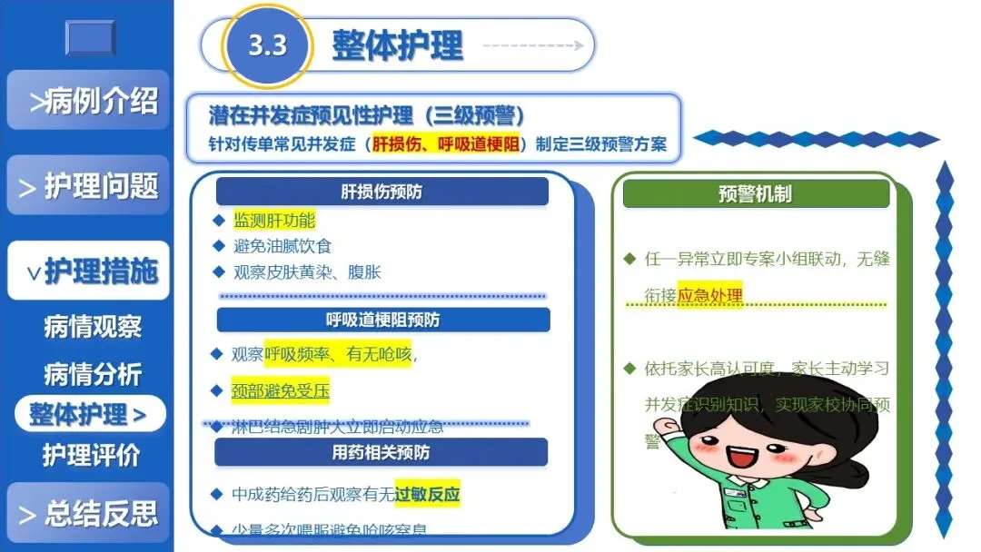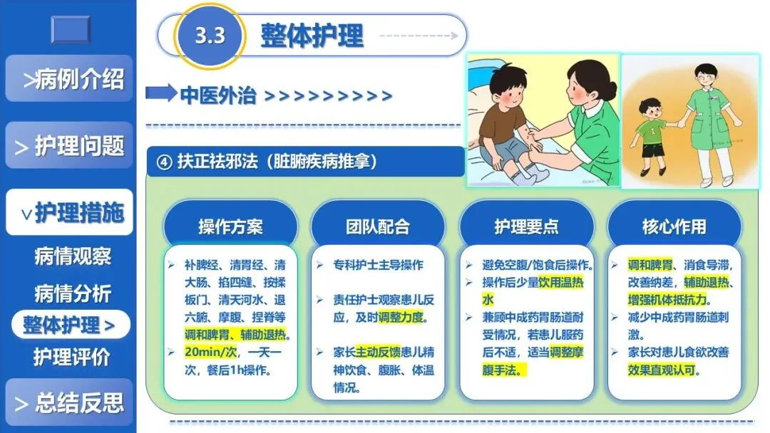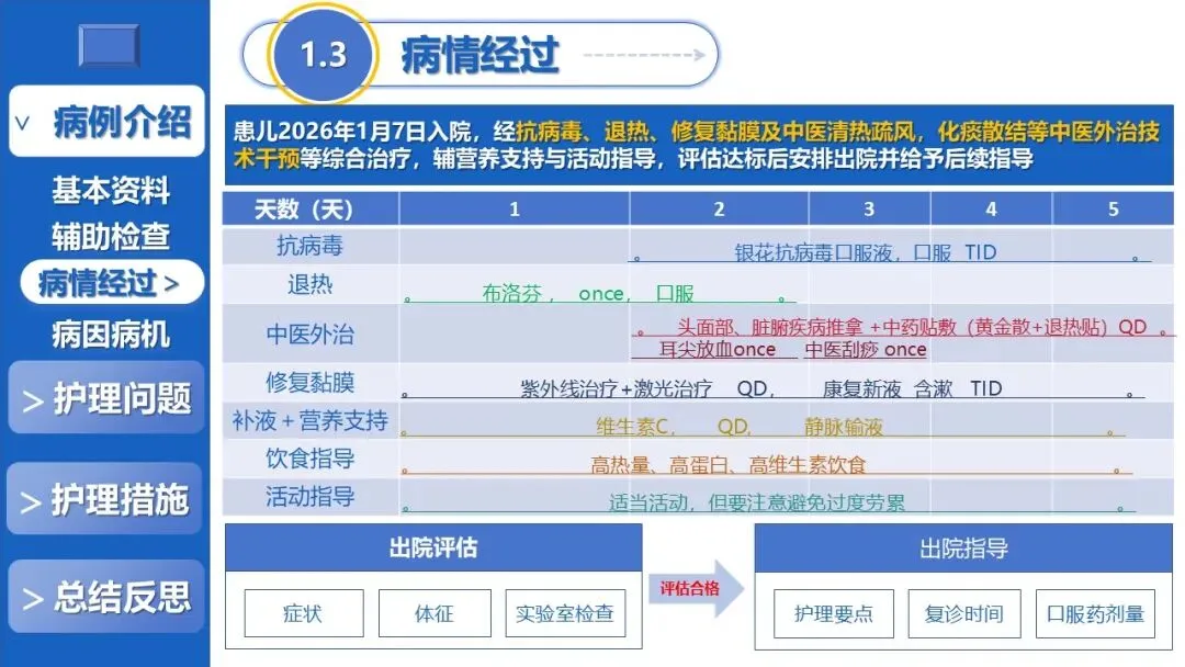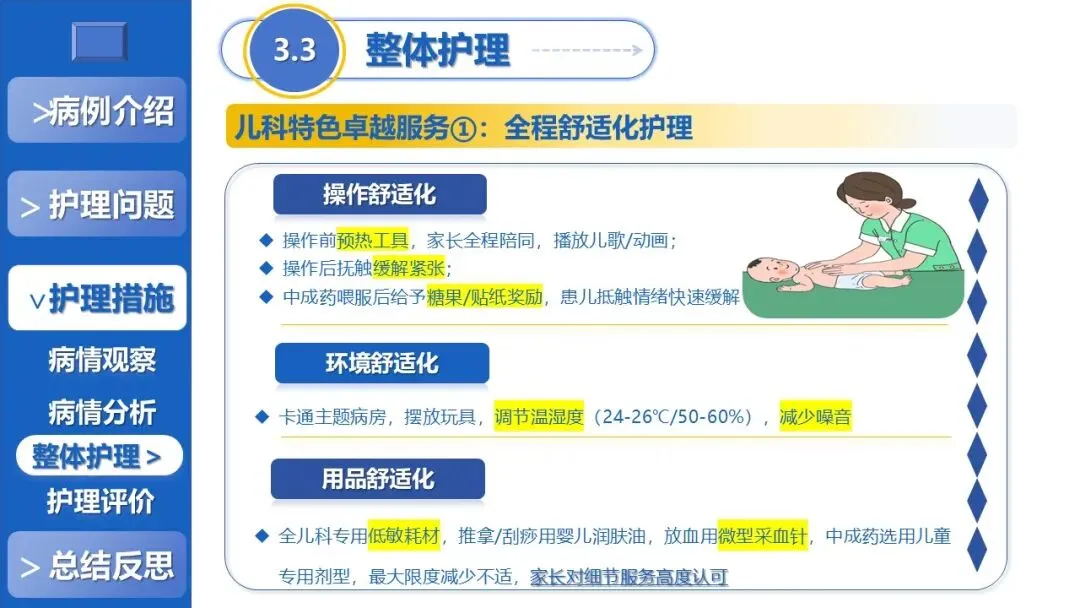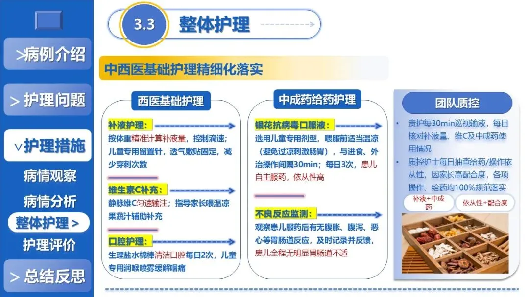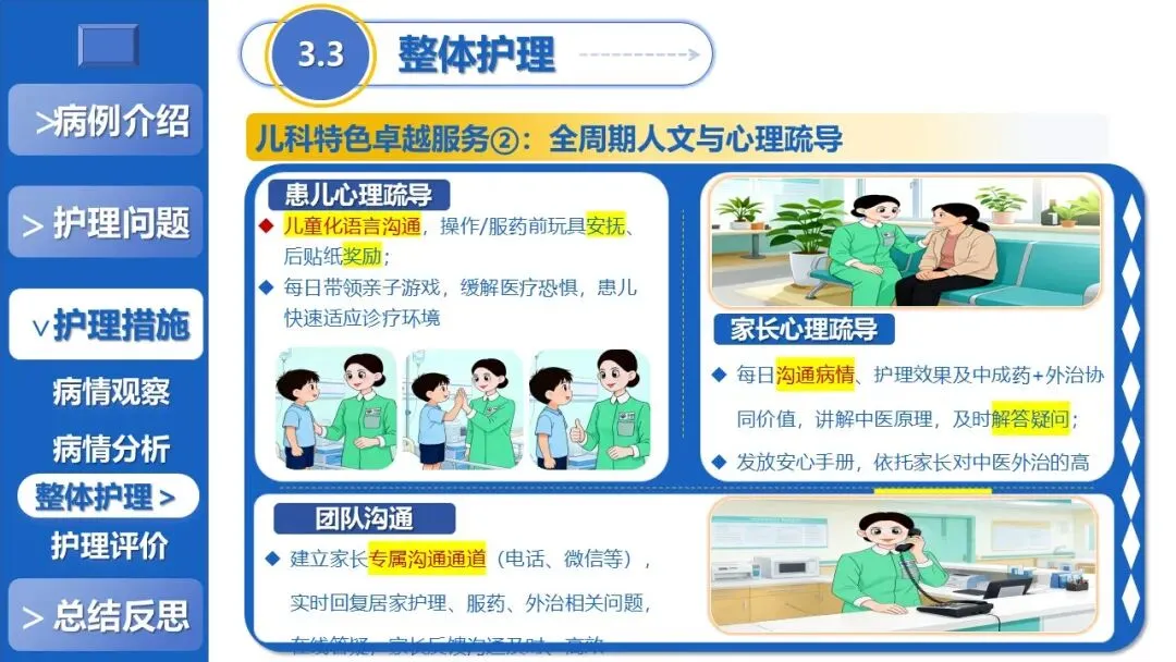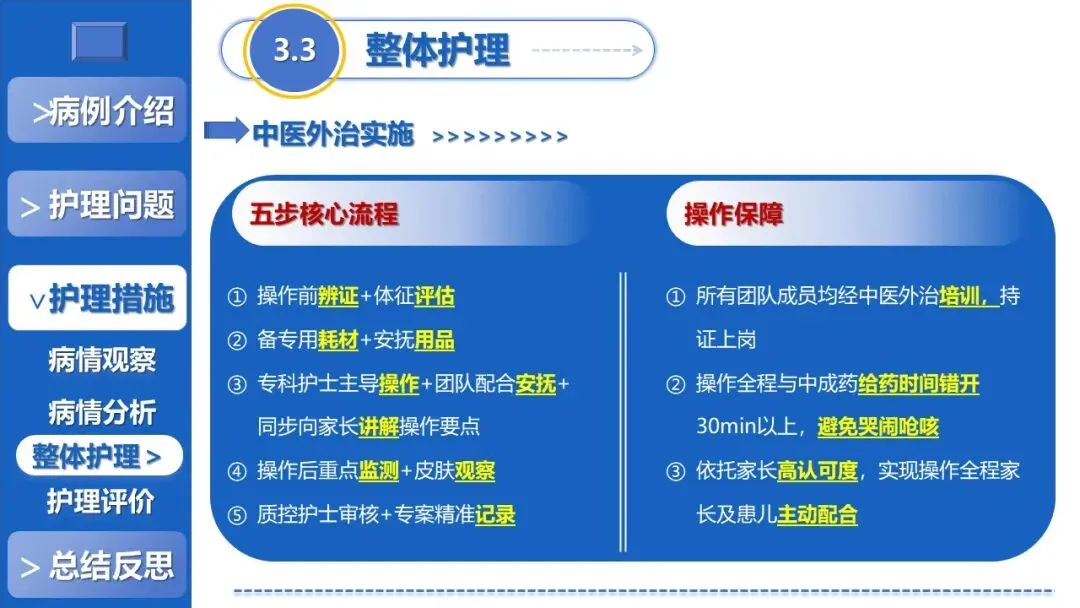 课件核心阐述了特色护理方案,以退热贴敷+放血、黄金散贴敷、推拿等5项中医外治为核心,搭配银花抗病毒口服液辅助、西医补液+维C基础支持,定制贴合患儿生理节律的外治个体化时序,同时建立多维度动态监测体系、制定并发症三级预警方案,融入儿科舒适化护理、全周期人文疏导与个性化健康宣教,构建高效家校协同护理模式。