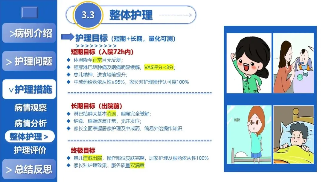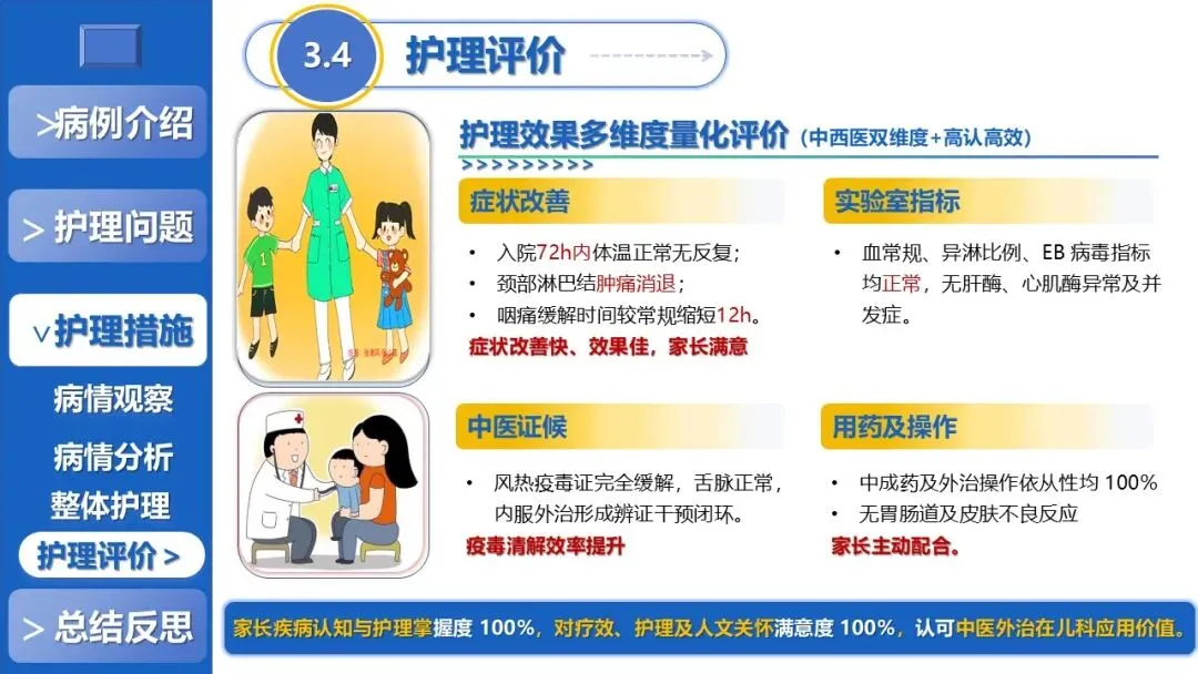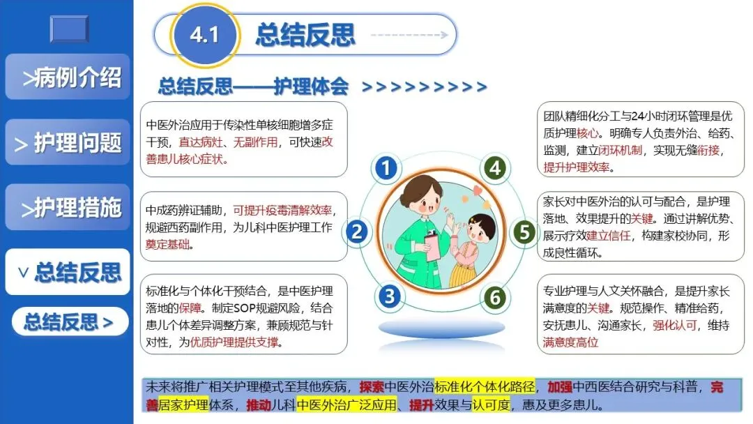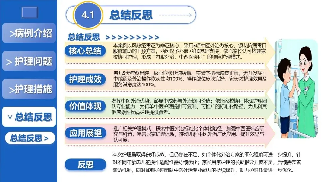 课件展示了患儿72h内体温复常、5天痊愈出院的显著护理成效,总结了中医外治应用、团队闭环管理等护理体会,反思现有不足并提出应用展望,为儿科感染性疾病的中西医结合护理提供了可复制、可推广的实践参考。