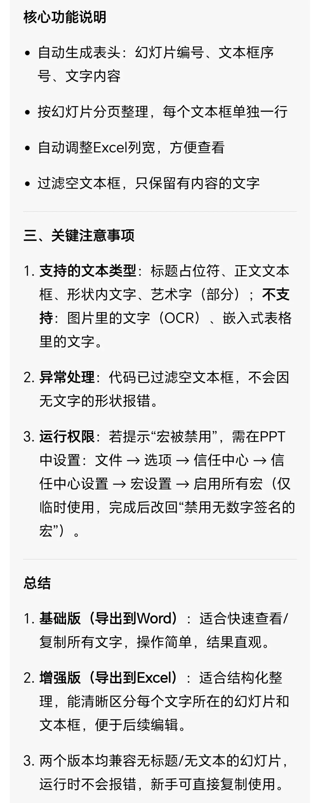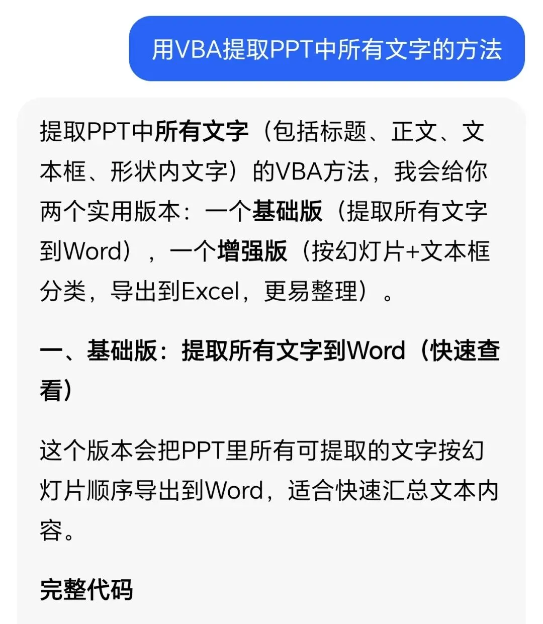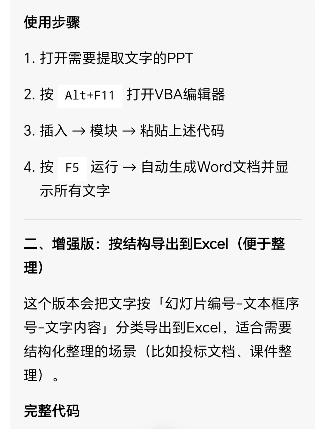 前两天由于工作需要,想把PPT中所有的文字提取到excel中进行编辑,如果一页一页复制再粘贴,太麻烦了,于是想到用VBA提取,VBA代码不会编写?那就让AI帮忙编吧!
