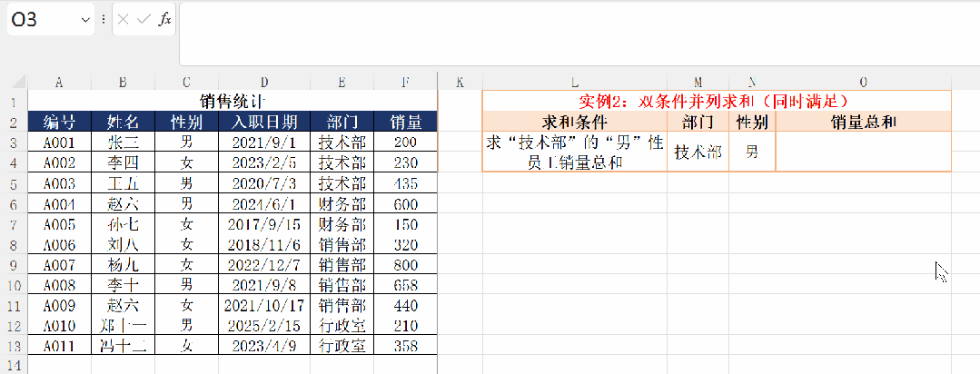 如上图,求和区域仍然为销量列,条件1区域为部门列,筛选条件值为技术部;条件2区域为性别列,筛选条件为男。对满足这两个条件的销量进行求和。实例3:区间+文本双条件求和