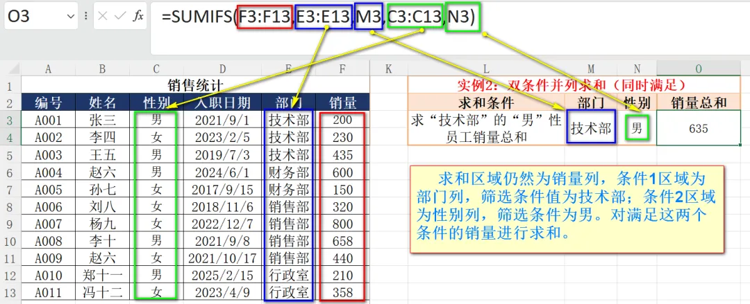 如上图所示,SUMIFS的第一个参数是就和区域F3:F13,即销量列;第二个参数为条件区域E3:E13,即部门列;第三个参数则是筛选条件值I3,即技术部。通过该公式即可求出“技术部”的所有员工销量总和,当我们更换部门时,公式便会求出相应部门的总销量。实例2:双条件并列求和(同时满足)