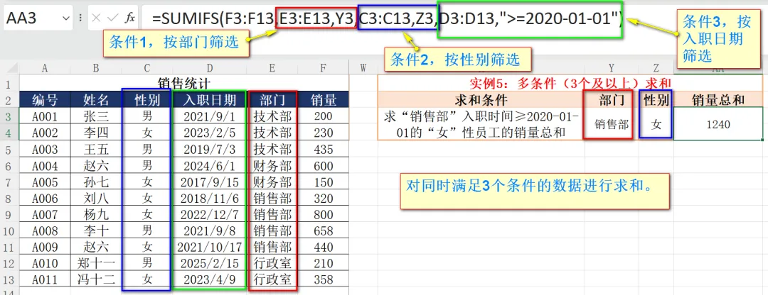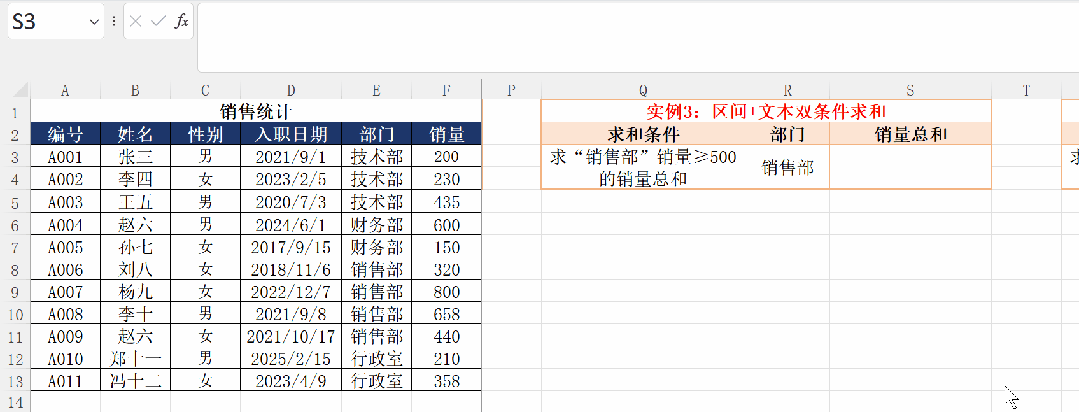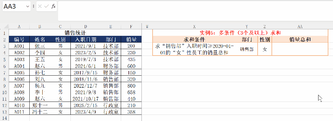 =SUMIFS(F3:F13,E3:E13,Y3,C3:C13,Z3,D3:D13,">=2020-01-01")求“销售部”入职时间≥2020-01-01的“女”性员工的销量总和实例6:排除特定条件求和