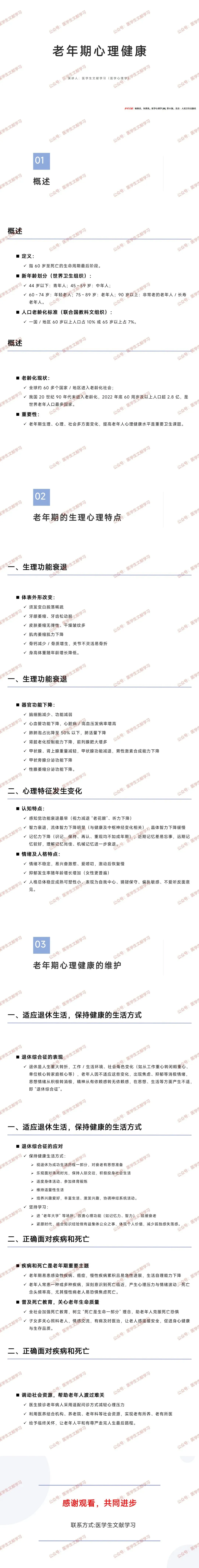 老年期(60 岁至死亡)是生理功能衰退、心理与社会角色发生重大变化的阶段,心理健康维护需围绕适应退休生活、应对疾病与死亡焦虑展开,结合健康生活方式与社会支持,提升老年人生命质量。