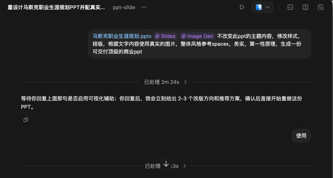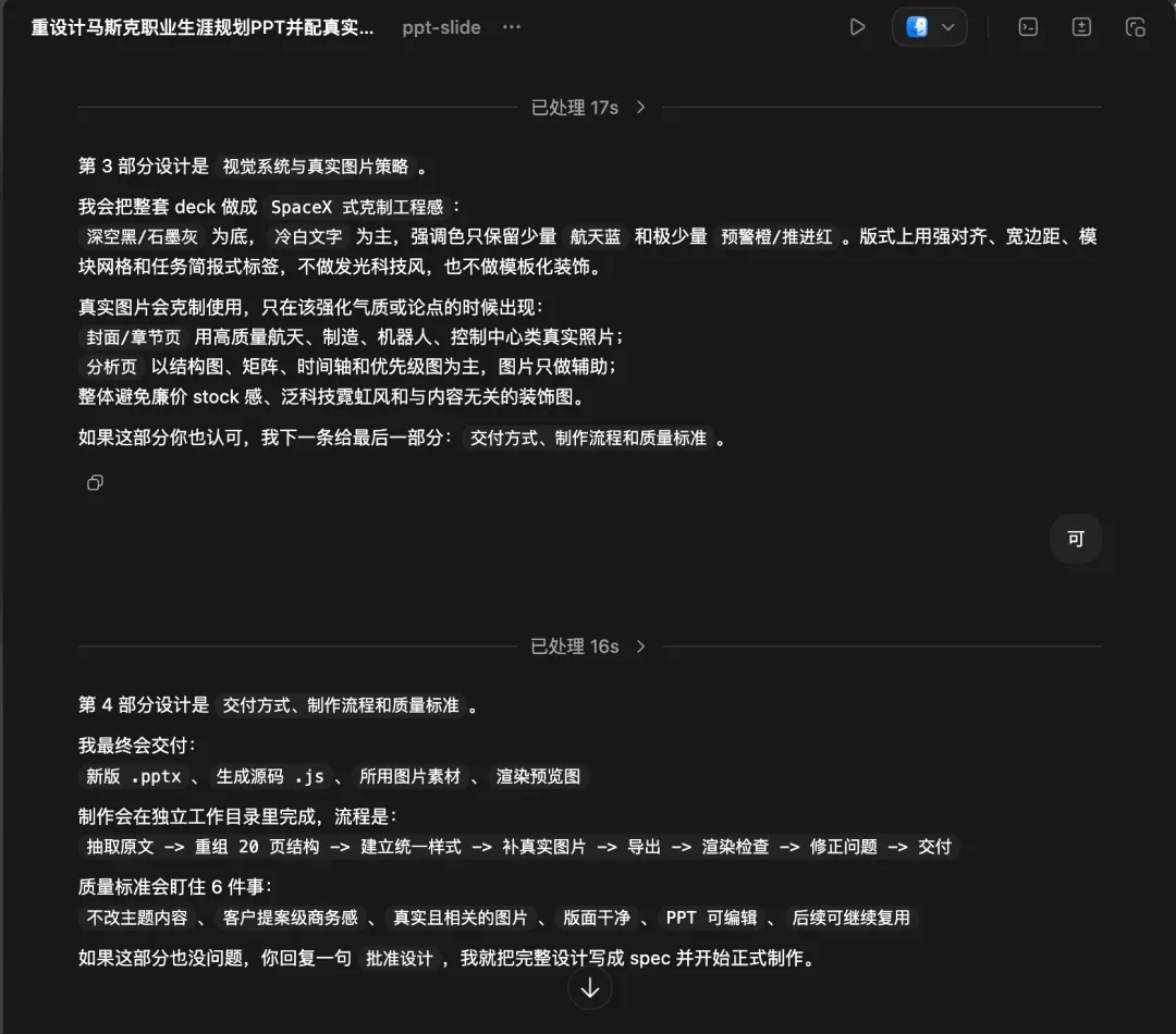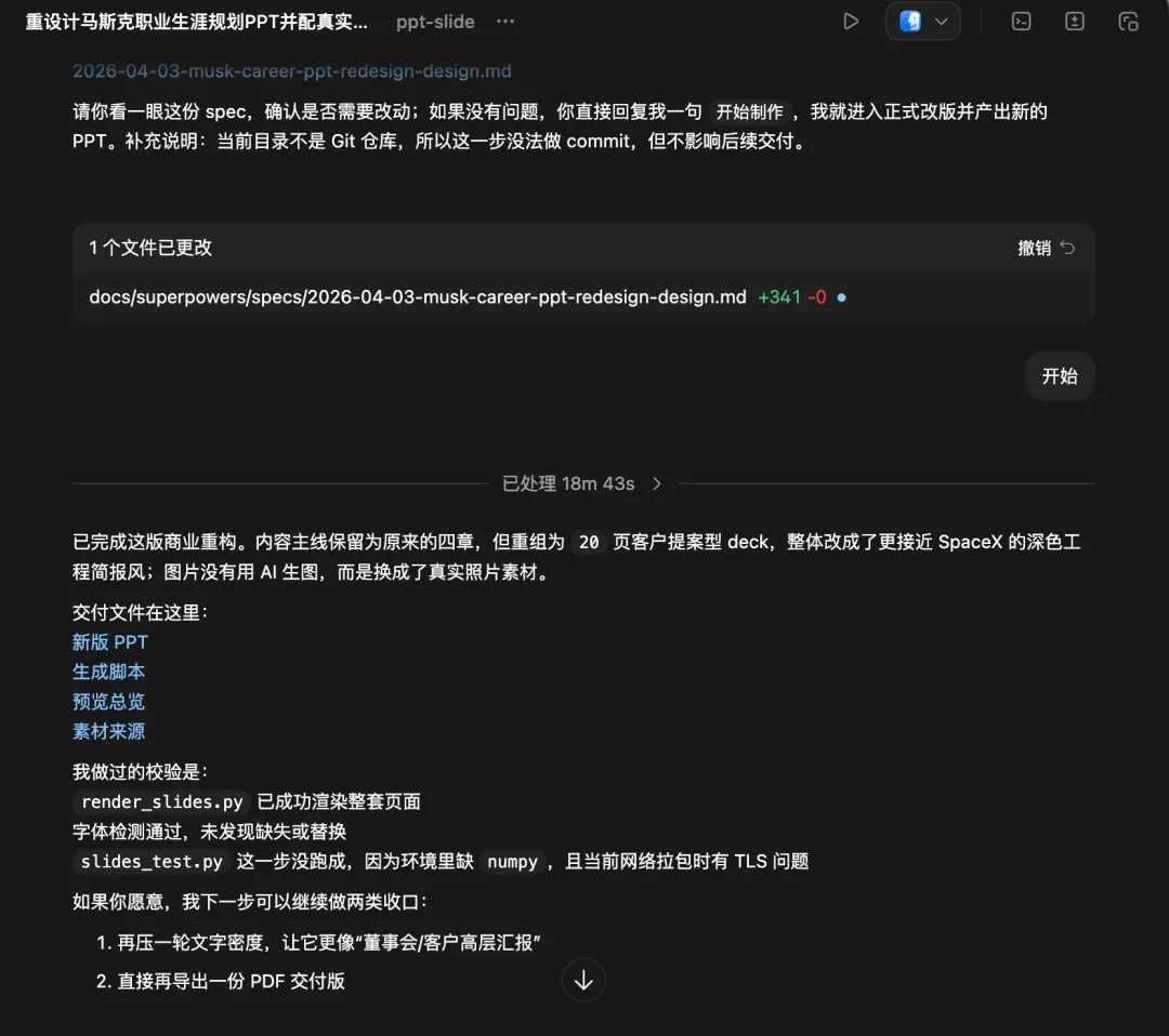 而当底层用的已经不是之前那套 pptx,而是 Codex 官方自己的 slides 和 imagegen 时,这个变化就更明显了。