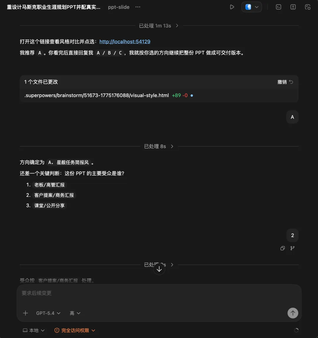 于是我这次没有让它再从头生成一份新的,而是直接把这份现成的 PPT 丢给 Codex。