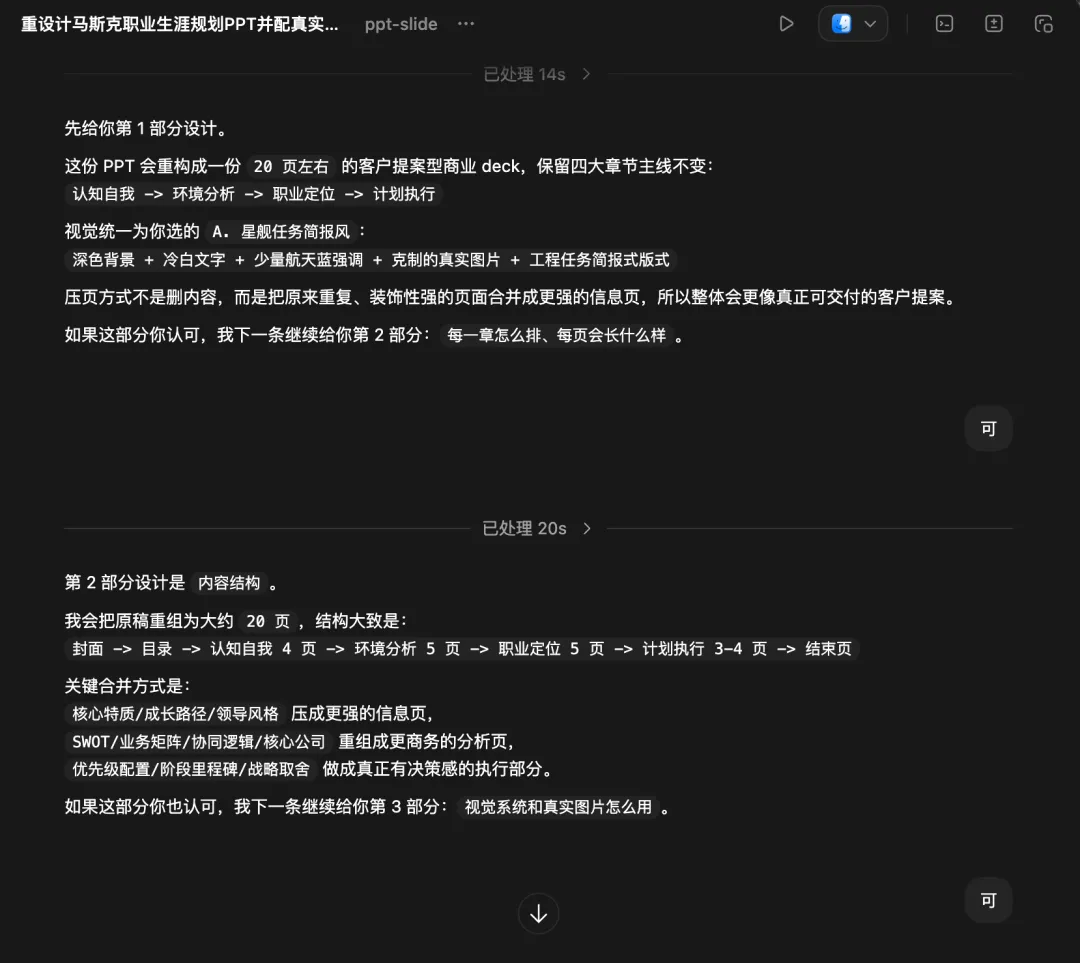 前几次我更多是在验证:AI 借助 pptx 这类技能,已经能把 PPT 生成、套模板、继续修改。