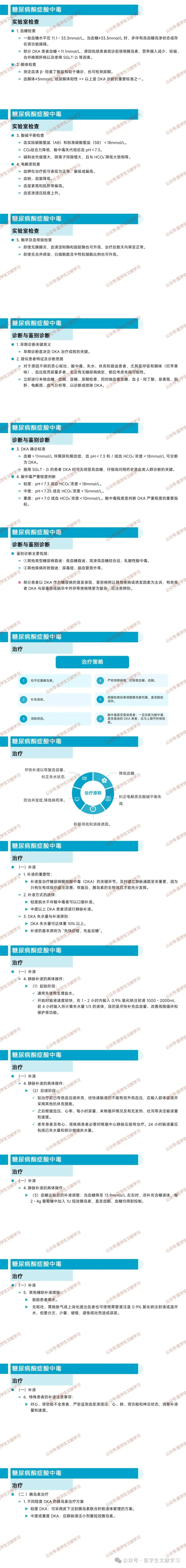 诊断与鉴别诊断:早期诊断关键,对疑似患者应及时检查相关指标。确诊标准为血糖>11mmol/L 伴酮尿和酮血症,血 pH<7.3 和 / 或血 HCO₃⁻浓度<18mmol/L 。需与其他类型糖尿病昏迷和其他疾病所致昏迷鉴别。