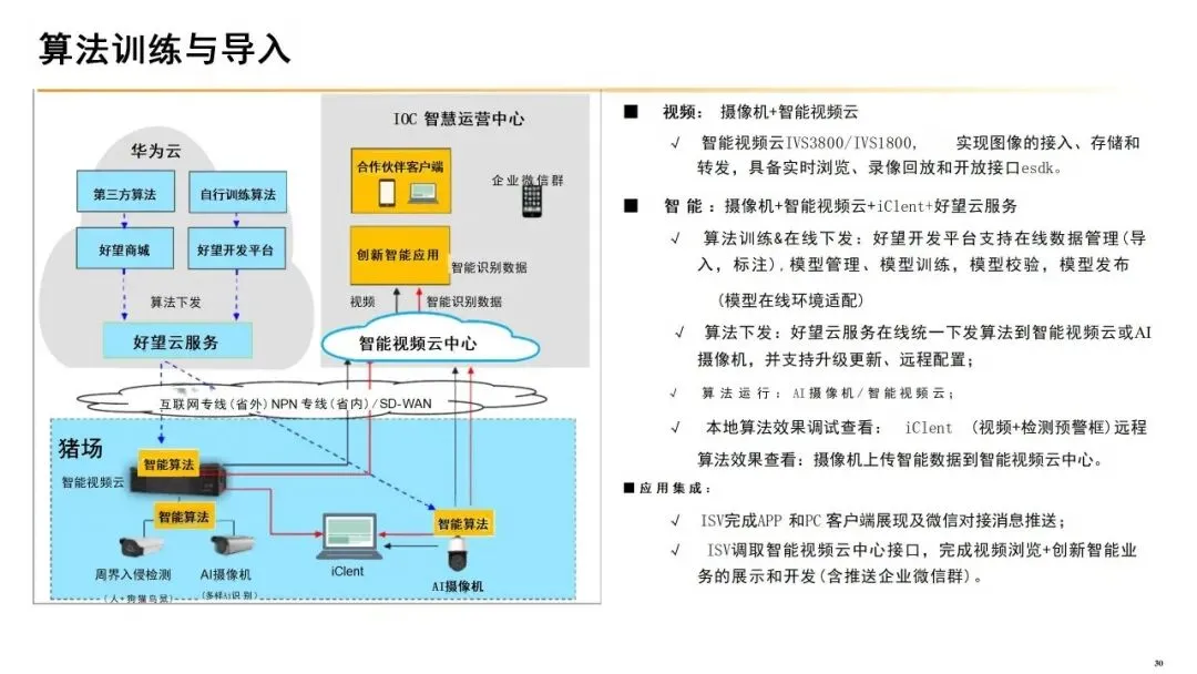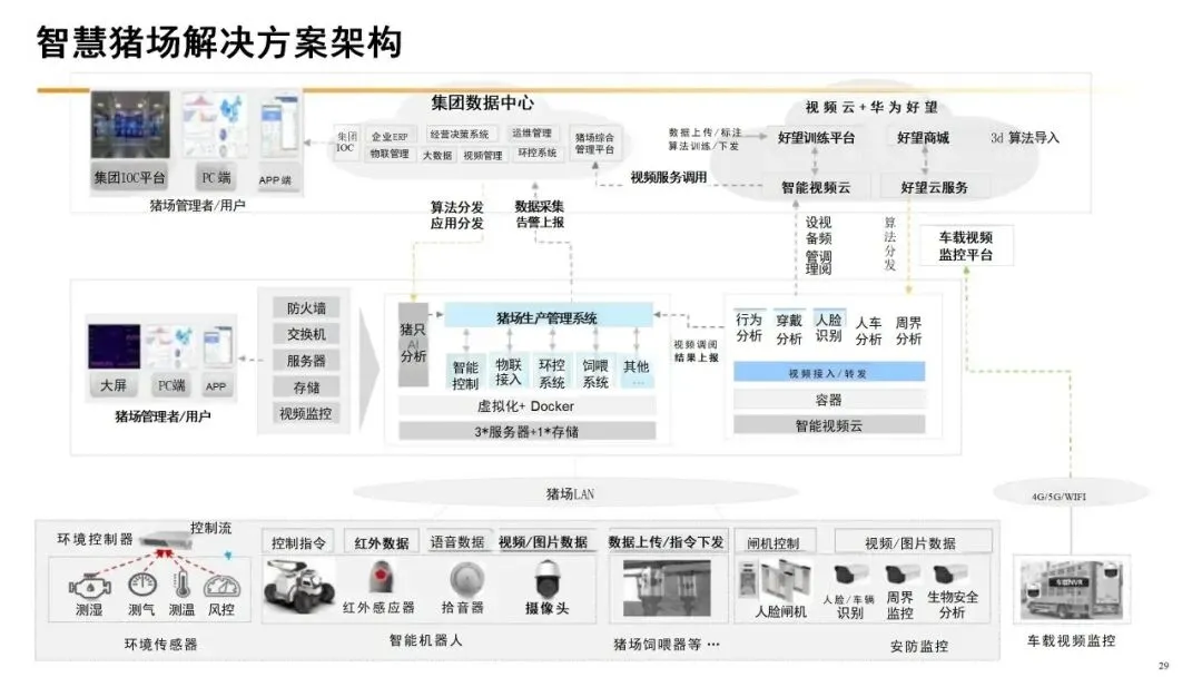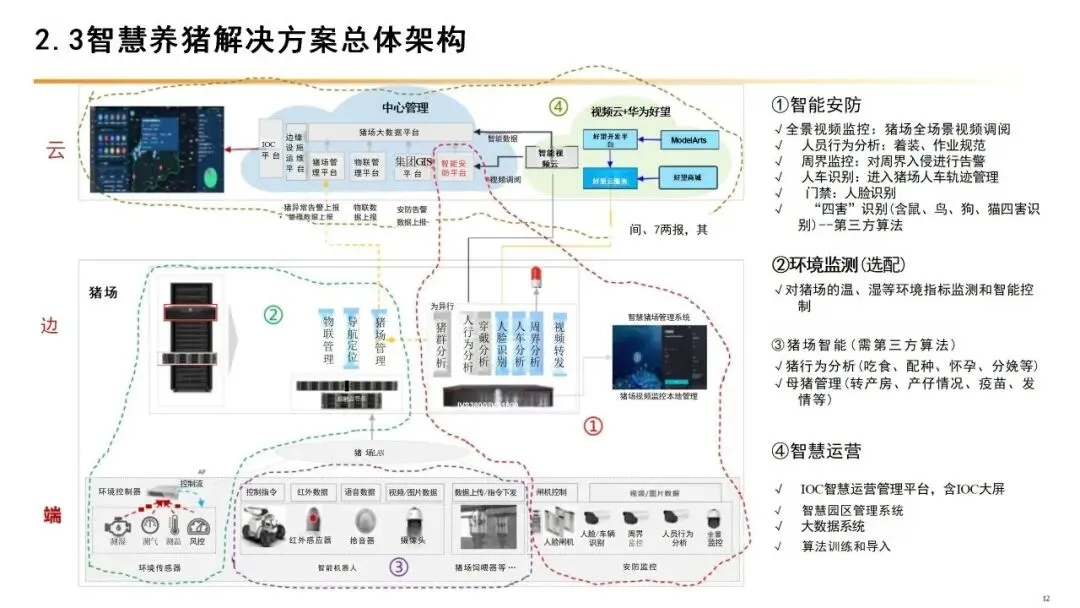 从核心构成来看,智慧养猪主要包含三大体系:一是感知体系,通过部署物联网传感器、AI摄像头等设备,实时采集猪舍温湿度、氨气浓度、猪只体重、采食情况等核心数据,实现养殖环境与猪只状态的全方位监测;二是决策体系,依托大数据分析与AI算法模型,对采集到的各类数据进行处理,生成精准饲喂、疫病预警、环境调控等决策建议;三是执行体系,通过自动饲喂设备、智能环控系统、清粪机器人等自动化装备,将决策落地,实现养殖流程的自动化、无人化操作。