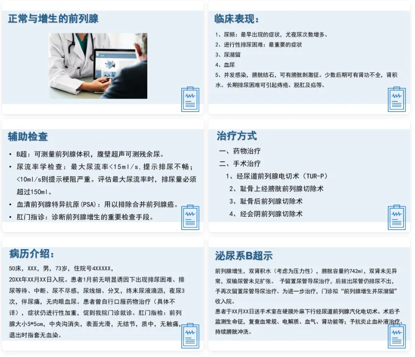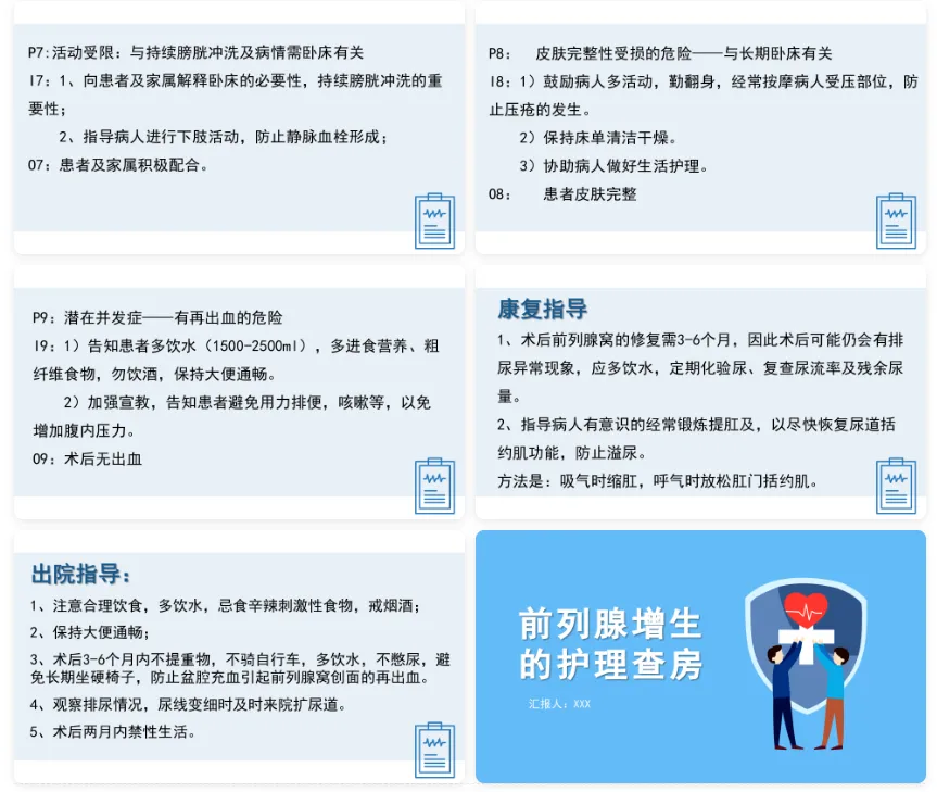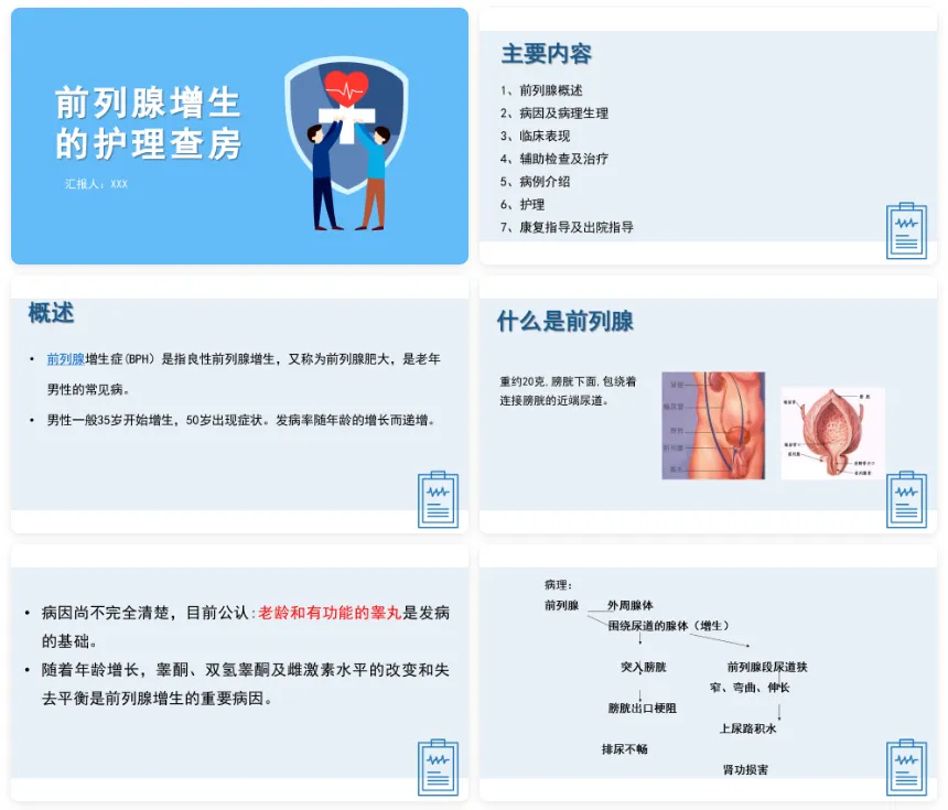 内容包括前列腺的概述、病因及病理生理、临床表现、辅助检查及治疗、病例介绍、护理诊断及措施、康复指导及出院指导。