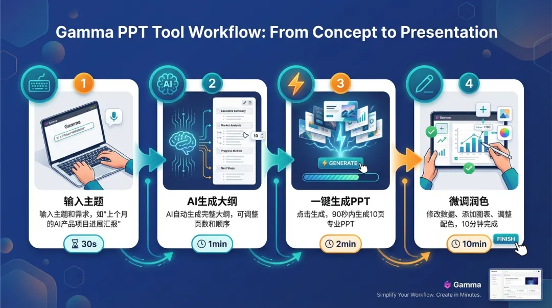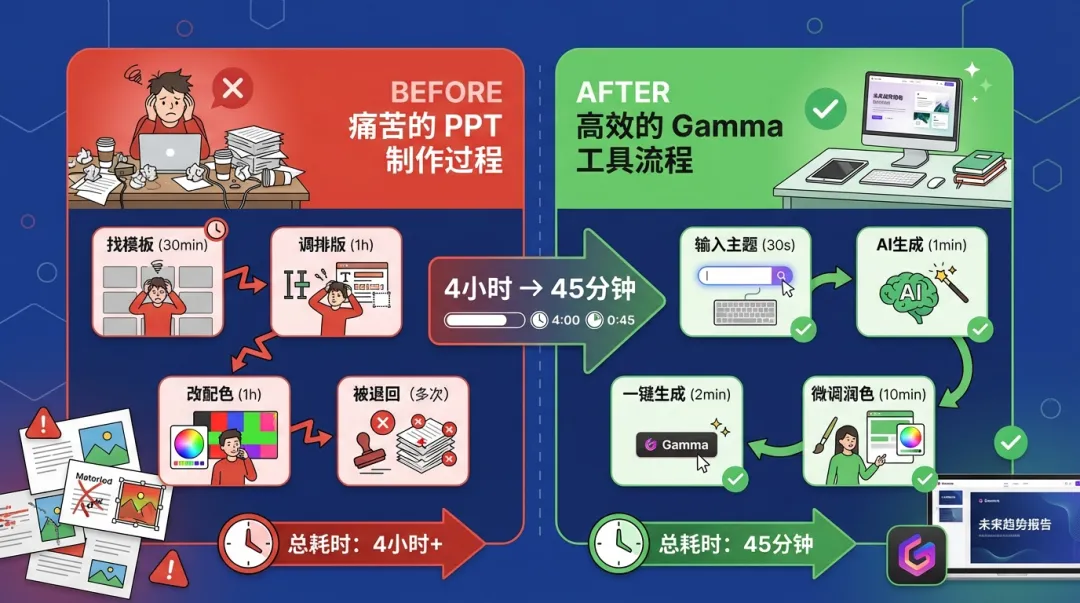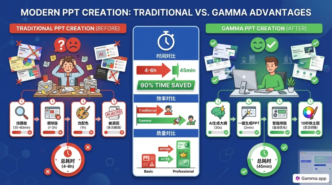 以前最怕"今天要PPT"——那意味着至少半天搭框架、找素材、调排版。现在我的心态是:给我45分钟,一份过得去的PPT没问题。