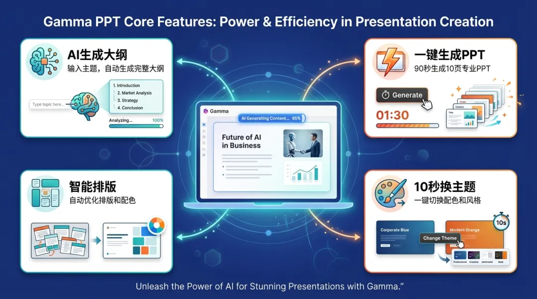 AI驱动的演示文稿生成工具你告诉它主题,它帮你生成完整PPT包括文字、排版、配图、配色,全套