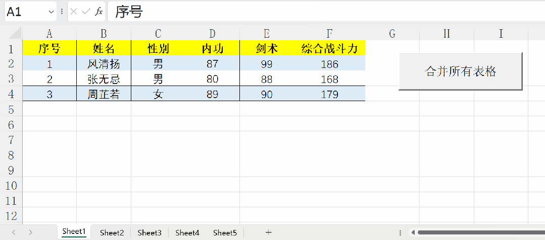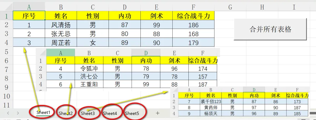 如下图,我们有5个excel表需要合并,为方便演示,每个表里面我们列了三行数据。如下图,当我们点击按钮后,这5个表瞬间被合并在总表里。二、VBA完整代码