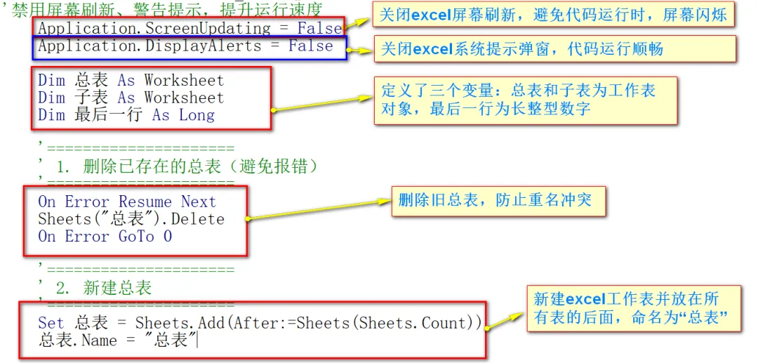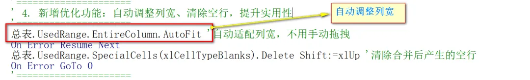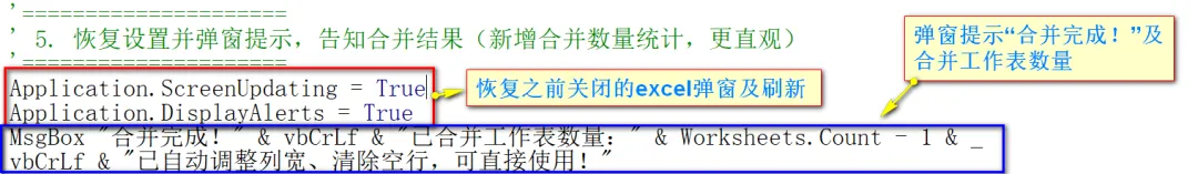 如上图,我们第1、2段代码的主要功能是删除旧的总表,新建新的总表如上图,第3段代码的主要功能是通过FOR循环,将所有子表的数据复制到总表。如上图,第4段的主要功能是自动调整总表的列宽,并清除合并后产生的空行。很多新手运行代码时会遇到「运行时错误 '1004':未找到单元格」,这是因为当总表没有空白单元格时,SpecialCells方法会触发报错。我在代码中加入了On Error Resume Next容错处理,彻底解决了这个问题,就算没有空行也能正常运行,不用手动修改代码。如上图,第5段代码的主要功能是恢复之前关闭的excel刷新及弹窗功能,弹窗提示“合并完成!”及合并工作表数量。四、总结