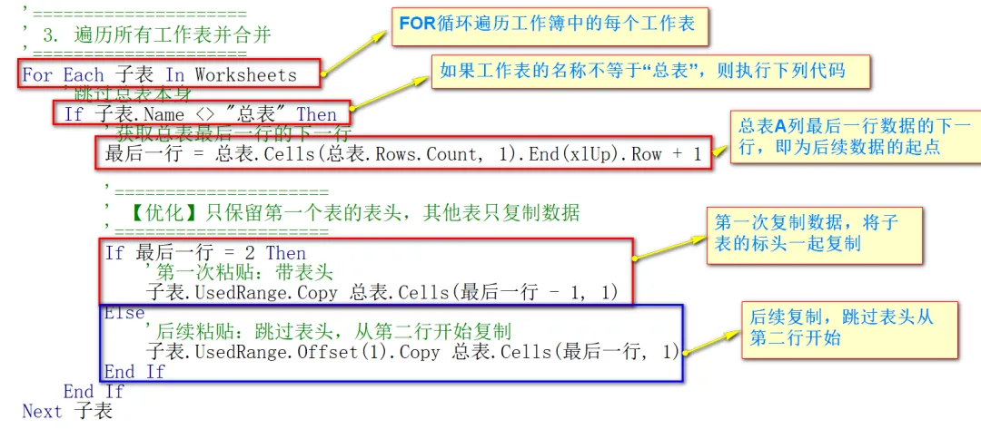 Private Sub CommandButton1_Click()'作者:办公必杀技 自用优化版(适配多场景数据合并,新增列宽调整、空行清除)'禁用屏幕刷新、警告提示,提升运行速度,避免弹窗干扰操作Application.ScreenUpdating = FalseApplication.DisplayAlerts = False' 1. 删除已存在的总表(避免重复创建报错,适配多次合并场景)On Error Resume Next '忽略删除不存在的“总表”时的报错On Error GoTo 0 '恢复正常报错提示,便于排查问题Set 总表 = Sheets.Add(After:=Sheets(Sheets.Count))For Each 子表 In Worksheets最后一行 = 总表.Cells(总表.Rows.Count, 1).End(xlUp).Row + 1' 核心优化:只保留第一个表的表头,其他表只复制数据'第一次粘贴:带表头(第一个子表的表头作为总表表头)子表.UsedRange.Copy 总表.Cells(最后一行 - 1, 1)子表.UsedRange.Offset(1).Copy 总表.Cells(最后一行, 1)' 4. 新增优化功能:自动调整列宽、清除空行,提升实用性总表.UsedRange.EntireColumn.AutoFit '自动适配列宽,不用手动拖拽总表.UsedRange.SpecialCells(xlCellTypeBlanks).Delete Shift:=xlUp'清除合并后产生的空行' 5. 恢复设置并弹窗提示,告知合并结果(新增合并数量统计,更直观)Application.ScreenUpdating = TrueApplication.DisplayAlerts = TrueMsgBox "合并完成!" & vbCrLf & "已合并工作表数量:" & Worksheets.Count - 1 & vbCrLf & "已自动调整列宽、清除空行,可直接使用!"三、代码解读