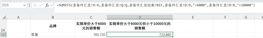 销售额统计:品牌为苹果,实销单价大于6,000元但小于10,000元(用于分析不同价格带产品的收入贡献)