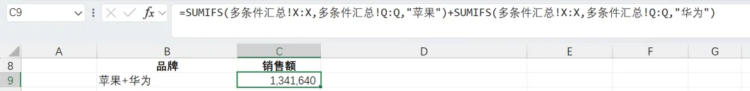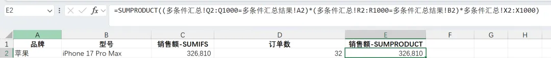 SUMPRODUCT可直接通过+条件的形式,在单公式内完成 “或” 条件求和,语法更简洁高效。