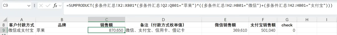 销售额统计:品牌为苹果,付款方式为微信或支付宝
