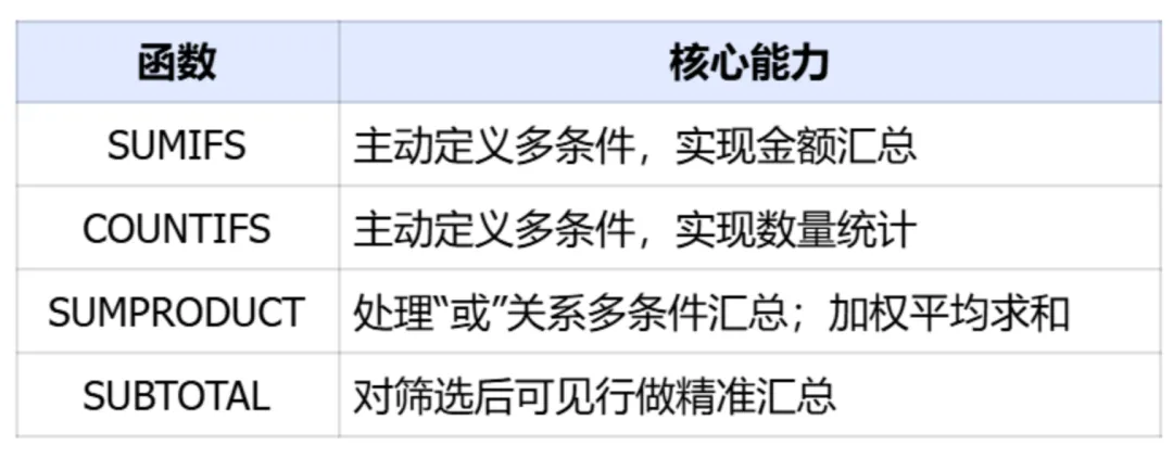 今天就讲财务汇总的4个核心函数——SUMIFS、COUNTIFS、SUMPRODUCT、SUBTOTAL,4大函数互补适配多数财务高频场景。