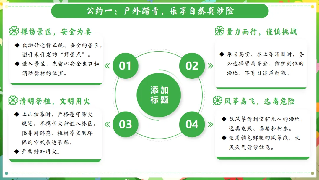 清明节春假安全教育主题班会(附24页ppt课件):文明祭扫平安出行,筑牢安全防线欢度清明假期(无水印可编辑ppt课件完整版,下载方式见文末)方式一:长按或扫描二维码加好友,截图告知进行 有偿 获取。