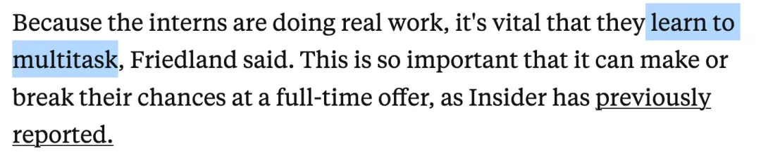 所有实习生每天的工作都是很丰富的。因此学会同时处理多项任务至关重要,“以至于决定了他们获得全职工作机会的成败。”