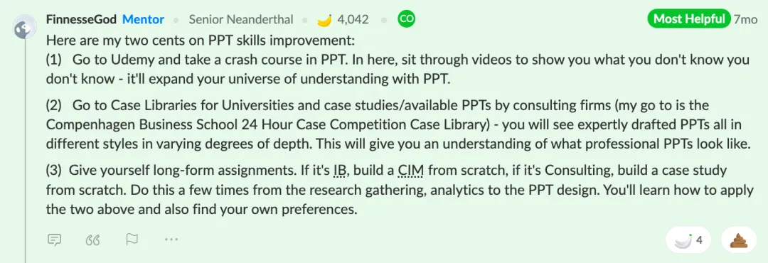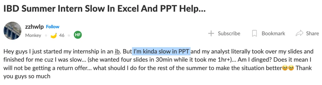 Dave强调,虽然Banker加班是基本操作,这并不意味着你加班多,就一定能拿到Return。处理多项任务最重要的是提高效率。特别是India和Dave都提到的PPT,这项占据新人80%时间的工作。快速完成PPT制作,恰恰是很多实习生进入投行后最大的问题。WSO上的一位IBD实习生就因为PPT做得太慢感到十分焦虑:Mentor要求30分钟做4张,我要做1个小时以上,结果活都被Mentor做了。这会不会影响我拿Offer,短时间内如何提高效率?