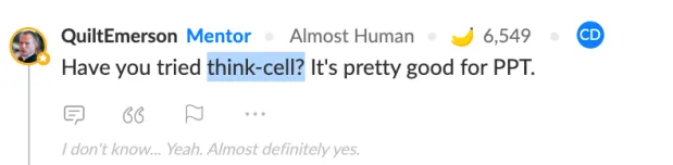 于是评论区的老手们纷纷建议,不如先借助工具提高自己的效率,比如Think-cell就是大家一致推荐的PPT插件。好上手,且一旦上手效率加倍。