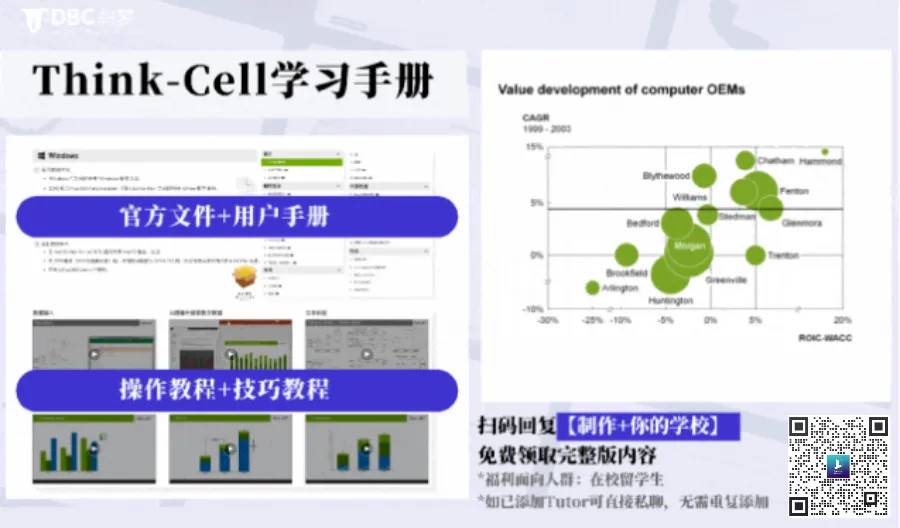 但是因为很多同学在开始工作前,并没有重视PPT的学习,因此求职市场上真正掌握这一神器的应届生并不多。一旦你成功掌握,即可脱颖而出,稳稳拿下投行入场券。主页君整理了一份Think-Cell学习手册,花3天学完即可掌握使用方法。内含:扫码回复【制作+你的学校】即刻免费获取这份学习礼包。正值春招季,提升自己才能突破高竞争率拿下Offer。