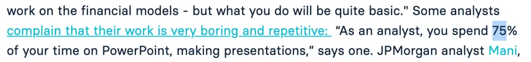 不仅是入行的Analyst需要花75%时间制作PPT,即使升职到Associate Level也一样,不仅如此,还要花时间帮Juniors修改PPT。