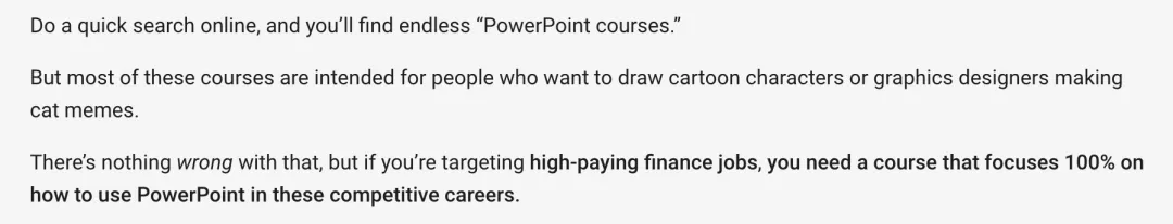 BIWS在官网表示,这是全网唯一给金融人准备的PPT课程,“和其他教你画卡通人物的PPT课程完全不同”,如果你的目标是高薪的金融工作,你就需要学习这门课程。