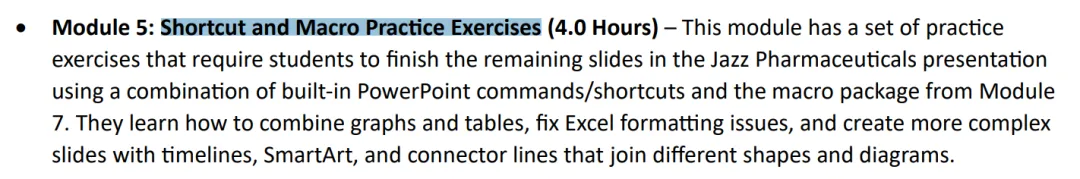如此自信自然有资本。BIWS这套PPT课完全Focus在Banker日常应用的PPT技能:小到分享Shortcuts提高效率,大到手把手教你Pitchbook的标准格式。7个Module用心学完,保证你直接从入门到高手。