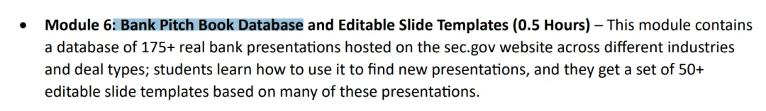 在WSO、Reddit上收获无数好评的PPT课程。《投行400问》原著机构发行,专门帮助求职投行的同学提升自己的PPT。你可以在课程中学到:课程共7个Module,每节课仅需20-30min,短平快。下载课程后可以自行规划自己的学习时间,一天掌握一个技巧。