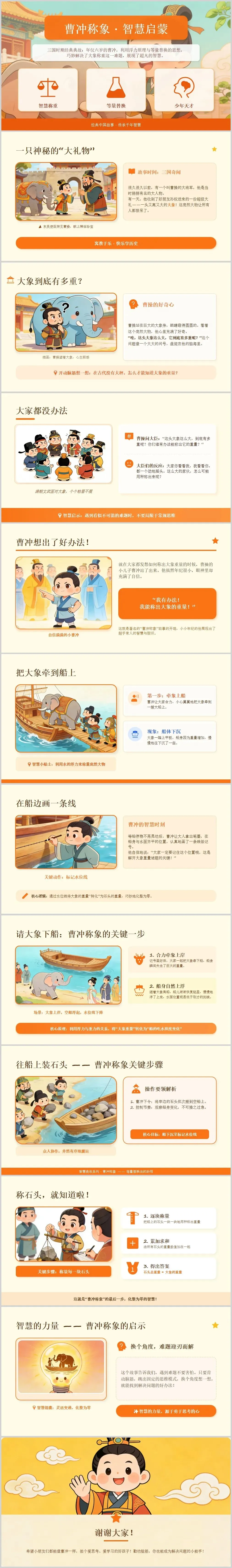 这个故事告诉我们,遇到难题的时候,不要着急,要像曹冲一样,多动脑筋、多思考,就一定能想出好办法!希望我们每个小朋友,都能做爱动脑筋、爱思考的好孩子,加油哦!我的演讲结束啦,谢谢大家~
