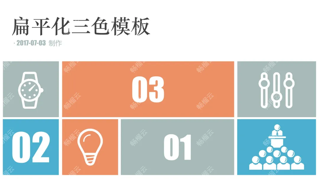这是一份PPT演示文稿,整体为扁平化三色风格,制作于2017年7月3日,包含01、02、03三个板块的内容说明模块,可用于基础内容展示、项目汇报等场景,版式简洁清晰,适配常规演示需求。