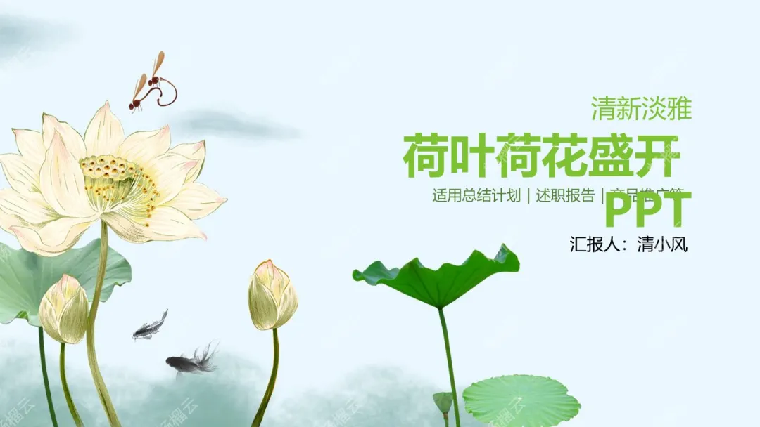 这是一份PPT演示文稿,整体风格清新淡雅,以盛开的荷叶荷花为视觉元素,适用于总结计划、述职报告、产品推广等多种场景,可自定义填写汇报内容与相关数据,适配多种商务汇报使用需求。